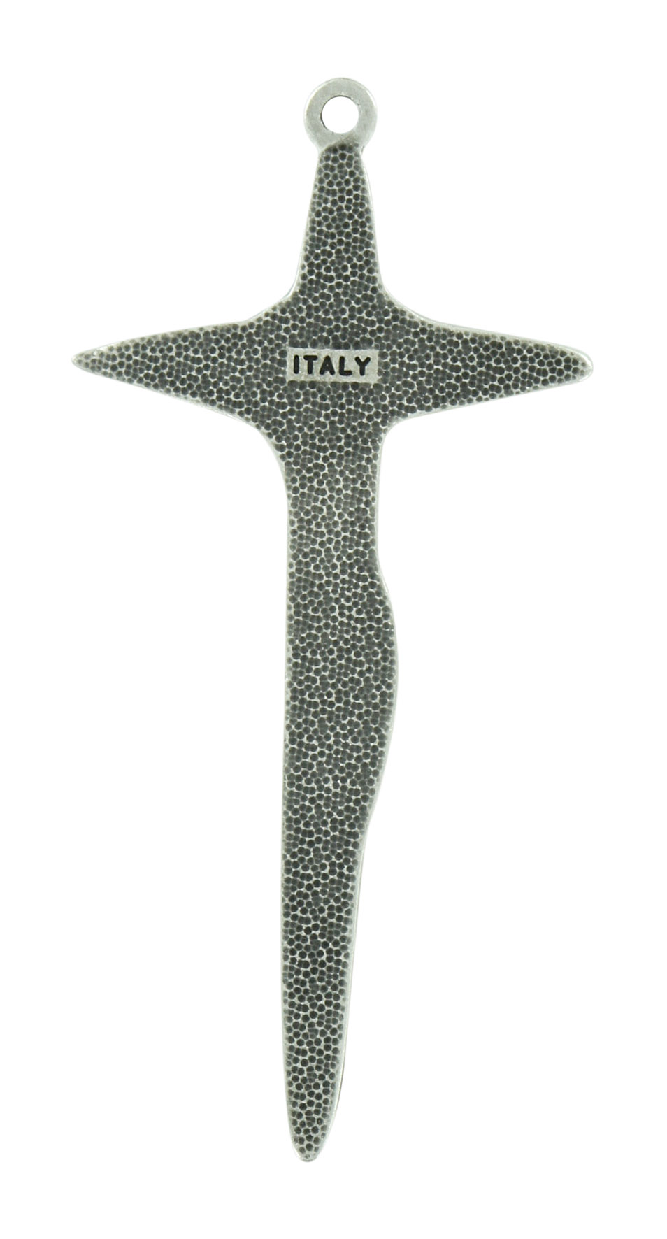 Questa croce in metallo argentato leggermente brunito è di cm 8. Lo stile moderno molto lineare ci presenta un Cristo di semplici fattezze.