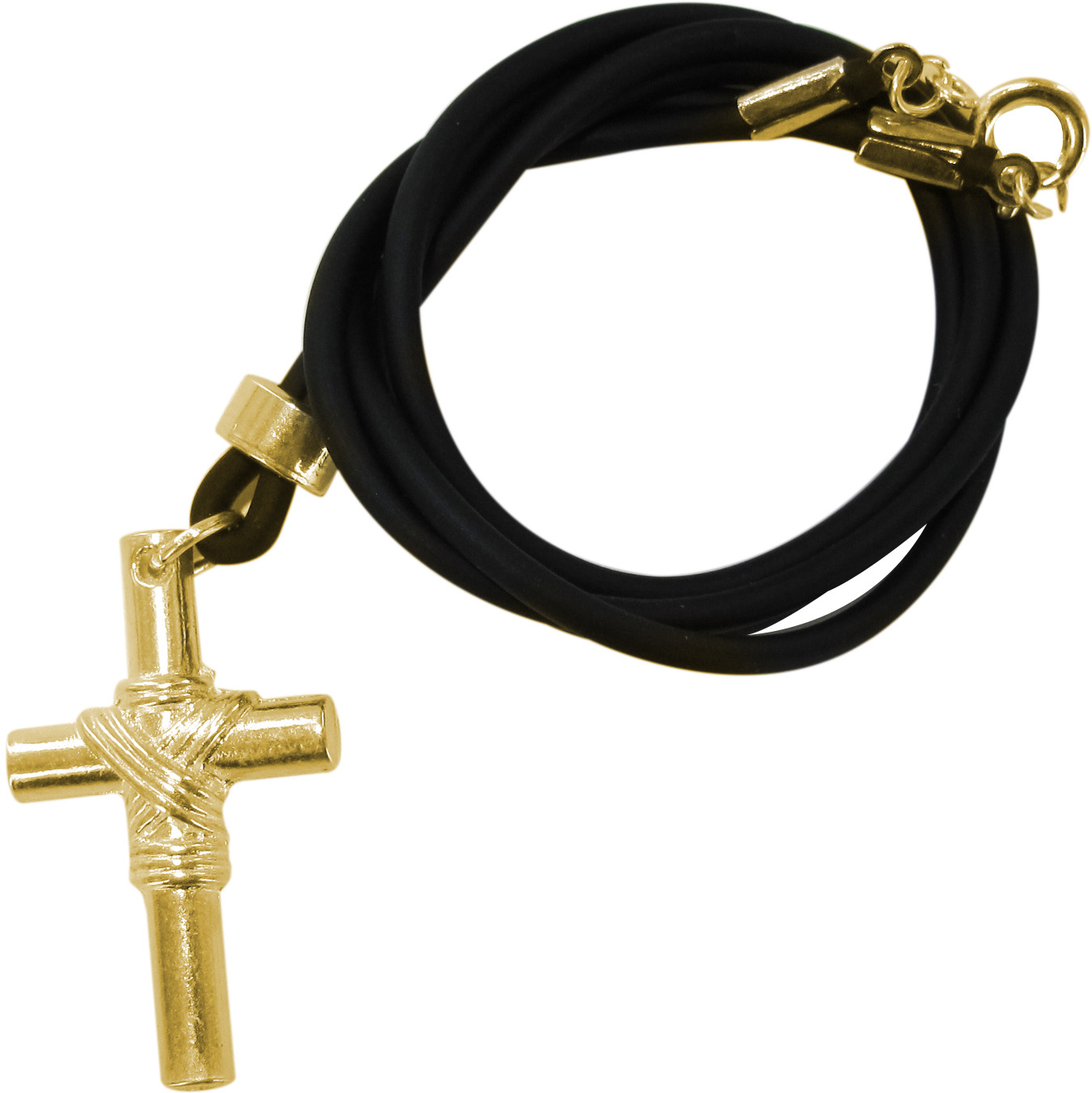 Croce in metallo dorato con cordoncino in caucciu nero. La croce misura 3 cm d'altezza, mentre il cordoncino misura 50 cm.