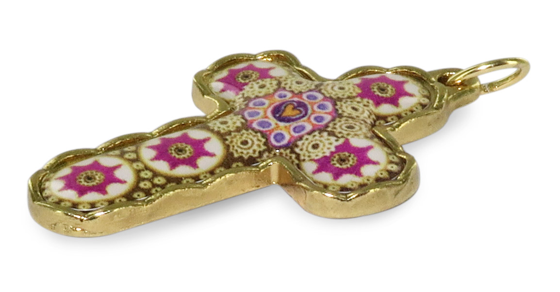 Le decorazioni all'interno della croce sono stampate su carta e rivestite da una resina trasparente che le rende lucide.