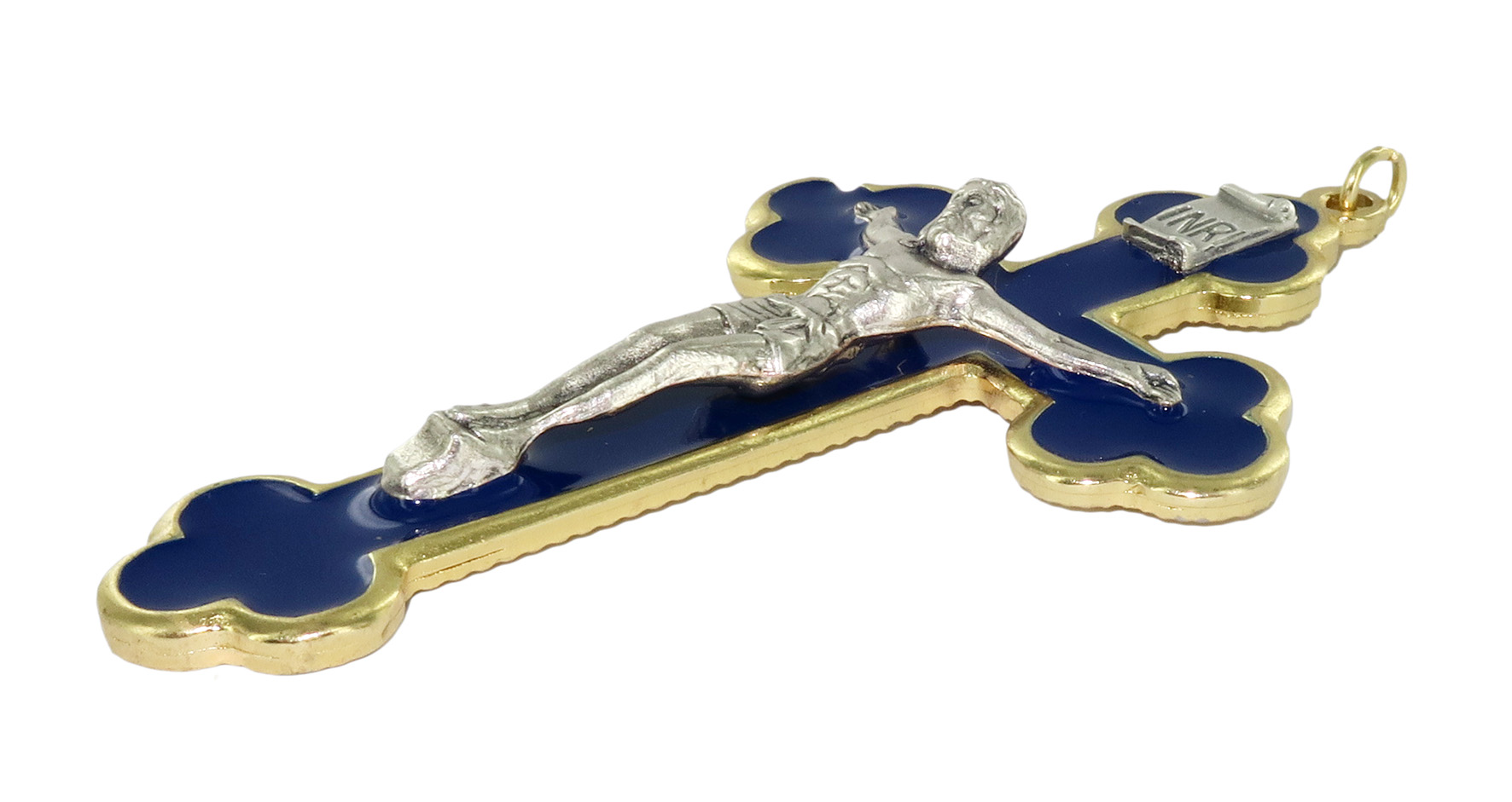 Croce in metallo dorato con smalto blu e Cristo riportato - 8 cm