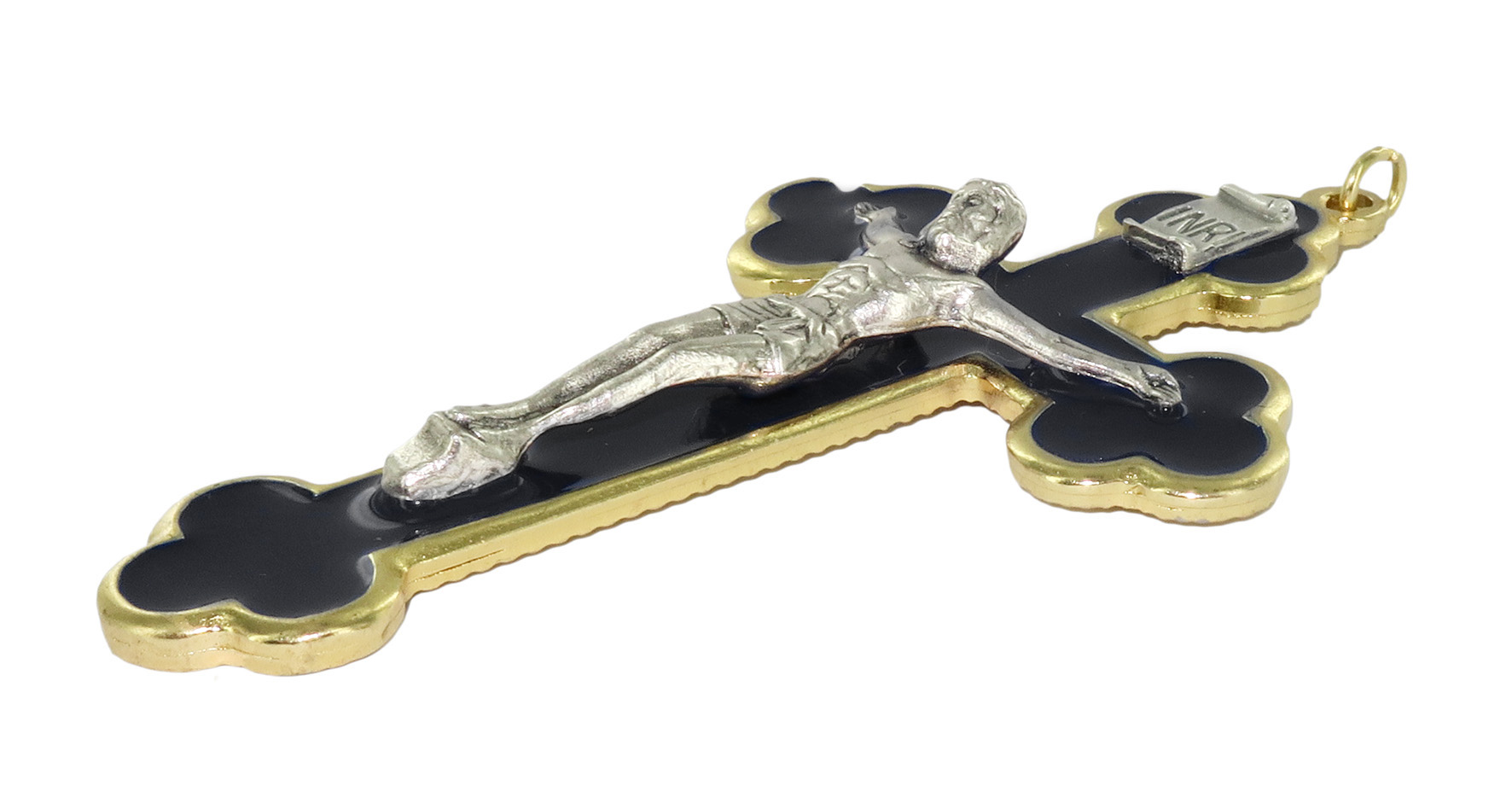 Croce in metallo dorato con smalto nero e Cristo riportato - 8 cm