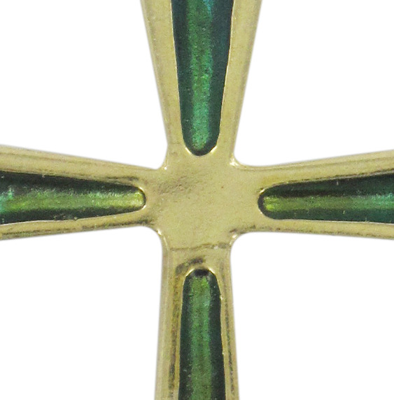 Croce in metallo dorato con smalto verde, da 7 cm.