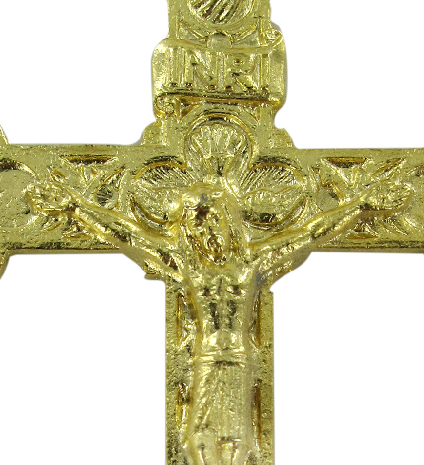 Croce in metallo dorato con il corpo di Cristo e quattro figure in più.