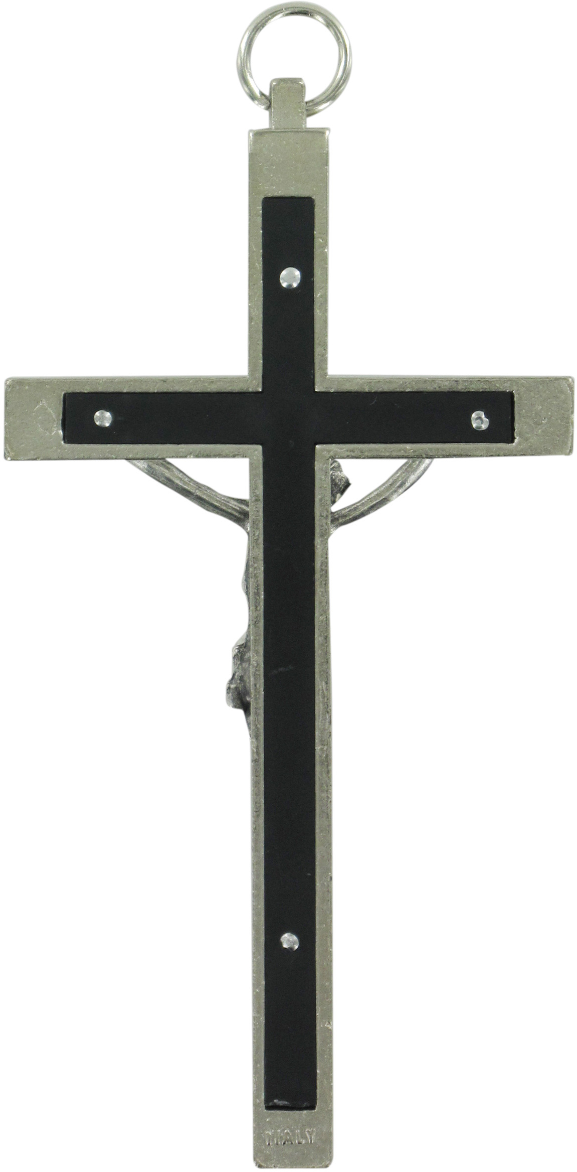 Croce in metallo nichelato con intarsio nero con riportatato Gesù in croce di misura 9 x 4,5 cm.