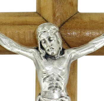Croce in legno d'ulivo con Cristo riportato in metallo argentato, da 8 cm.
