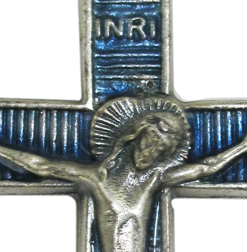Croce con Cristo stampato in metallo nichelato smaltata blu di misura 5 x 3 cm.