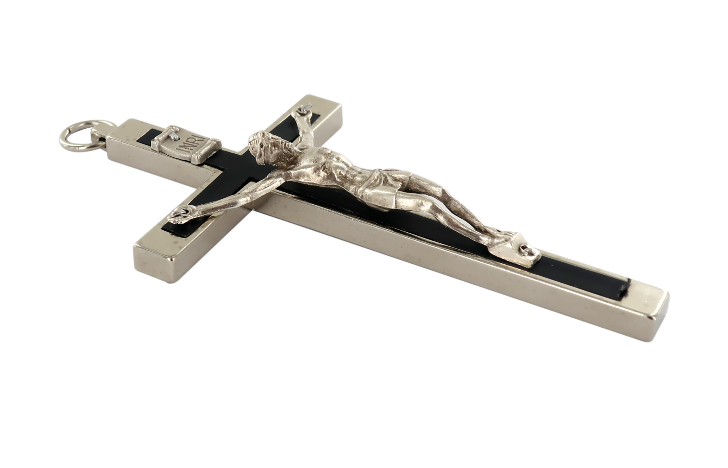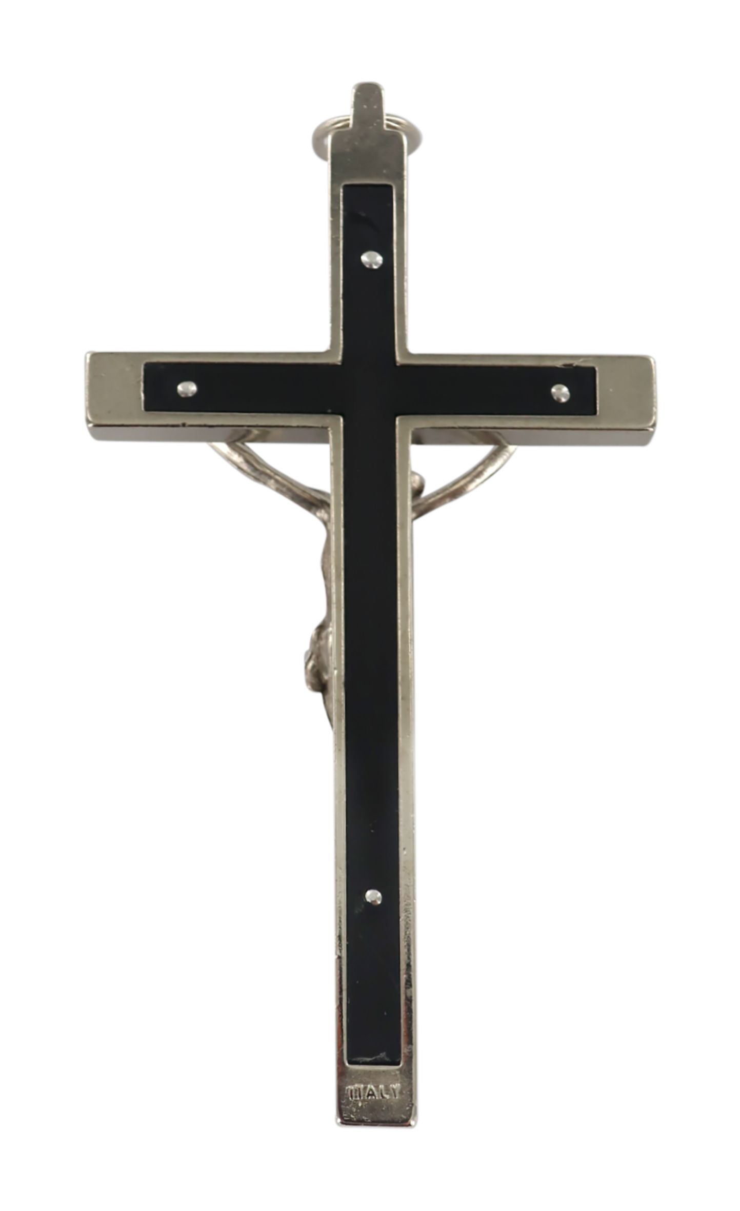 Croce in metallo nichelato con intarsio nero con riportato Gesù in croce. Misura 14 cm d'altezza. L'intarsio nero è presente su entrambe le facce della croce. Prodotto realizzato in Italia.