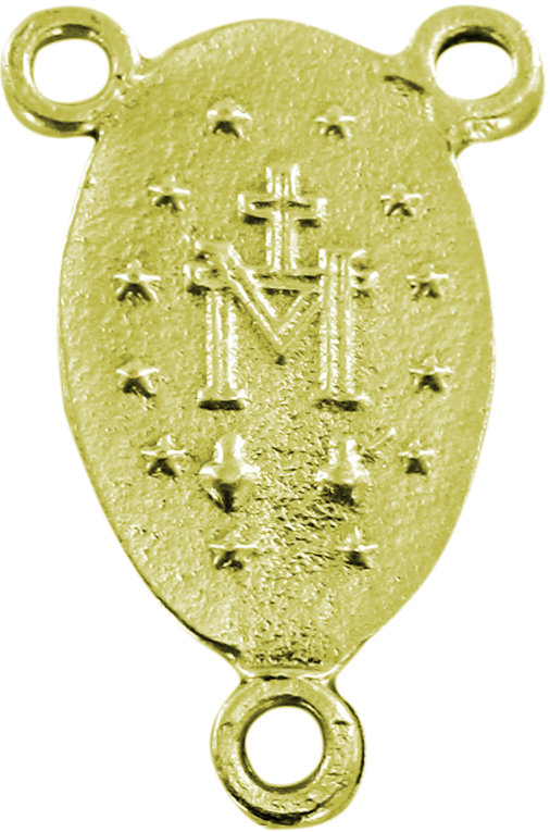 Crocera ovale per rosario realizzata in metallo dorato con l'immagine della Madonna Miracolosa. Realizzato in Italia.