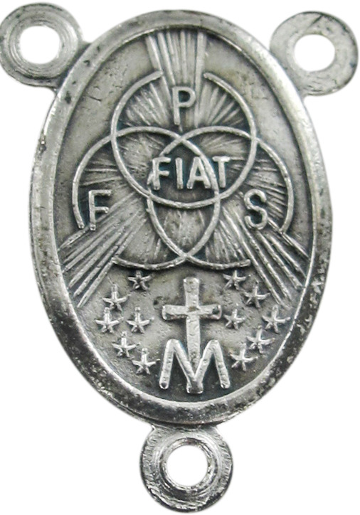 Crocera ovale per rosario realizzata in metallo ossidato, e sulla quale è raffigurato il simbolo dello Spirito Santo da un lato, e una colomba dall'altro. Realizzato in Italia.
