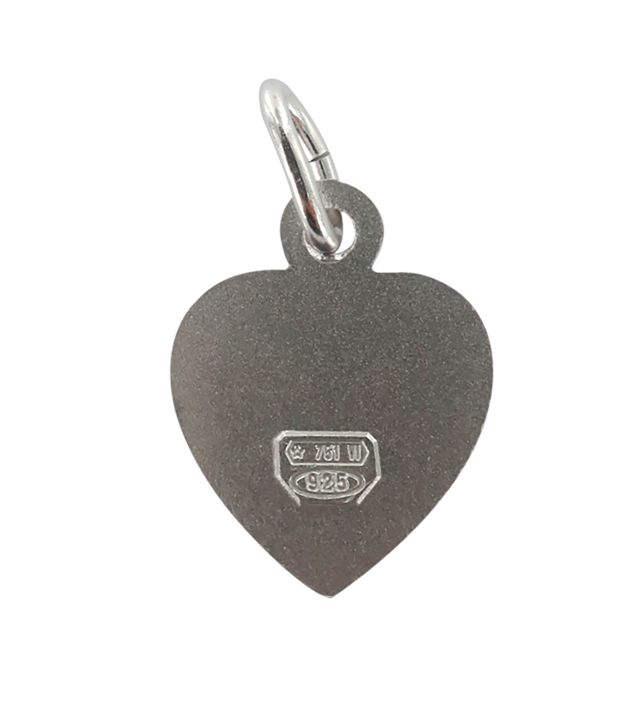 Ciondolo in argento 925 a forma di cuore con profilo zigrinato raffigurante il volto della Madonna Addolorata.