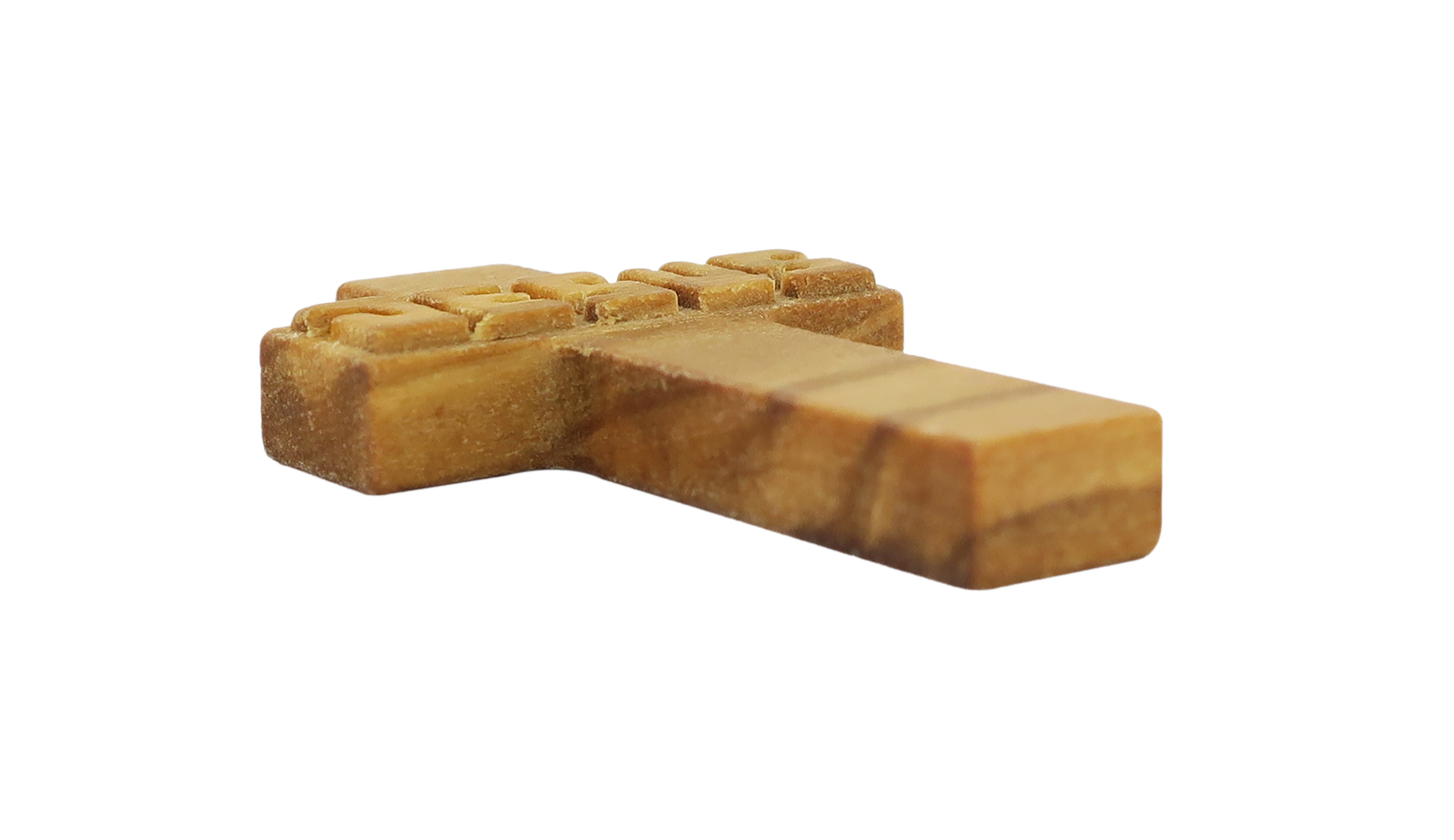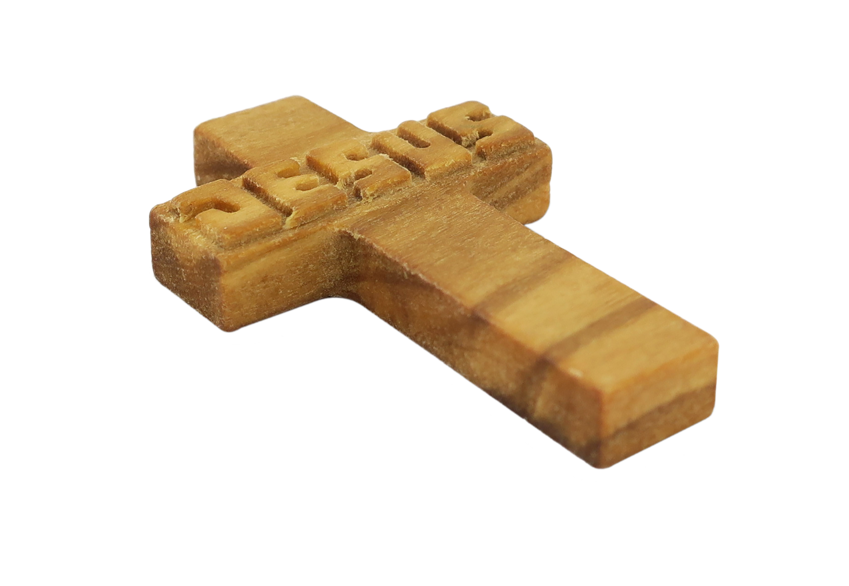 Croce in ulivo con scritta Jesus in rilievo e cordoncino marrone.