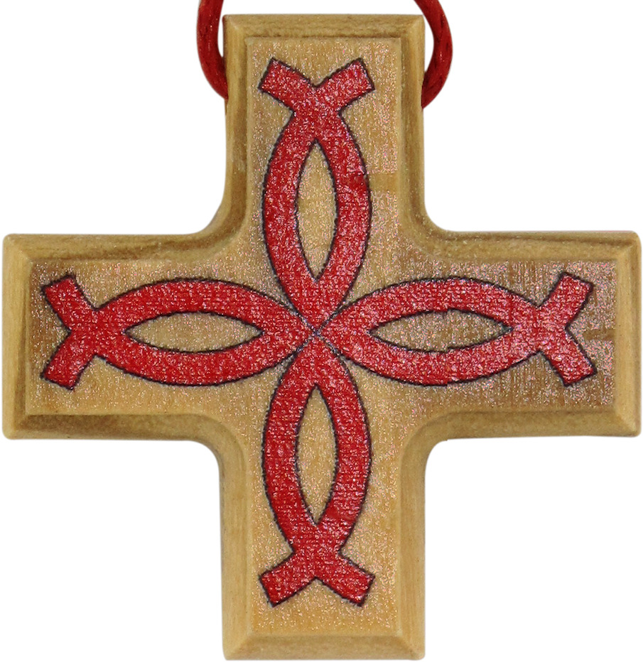 STOCK: Croce in legno d'ulivo con pesci e laccio rosso.