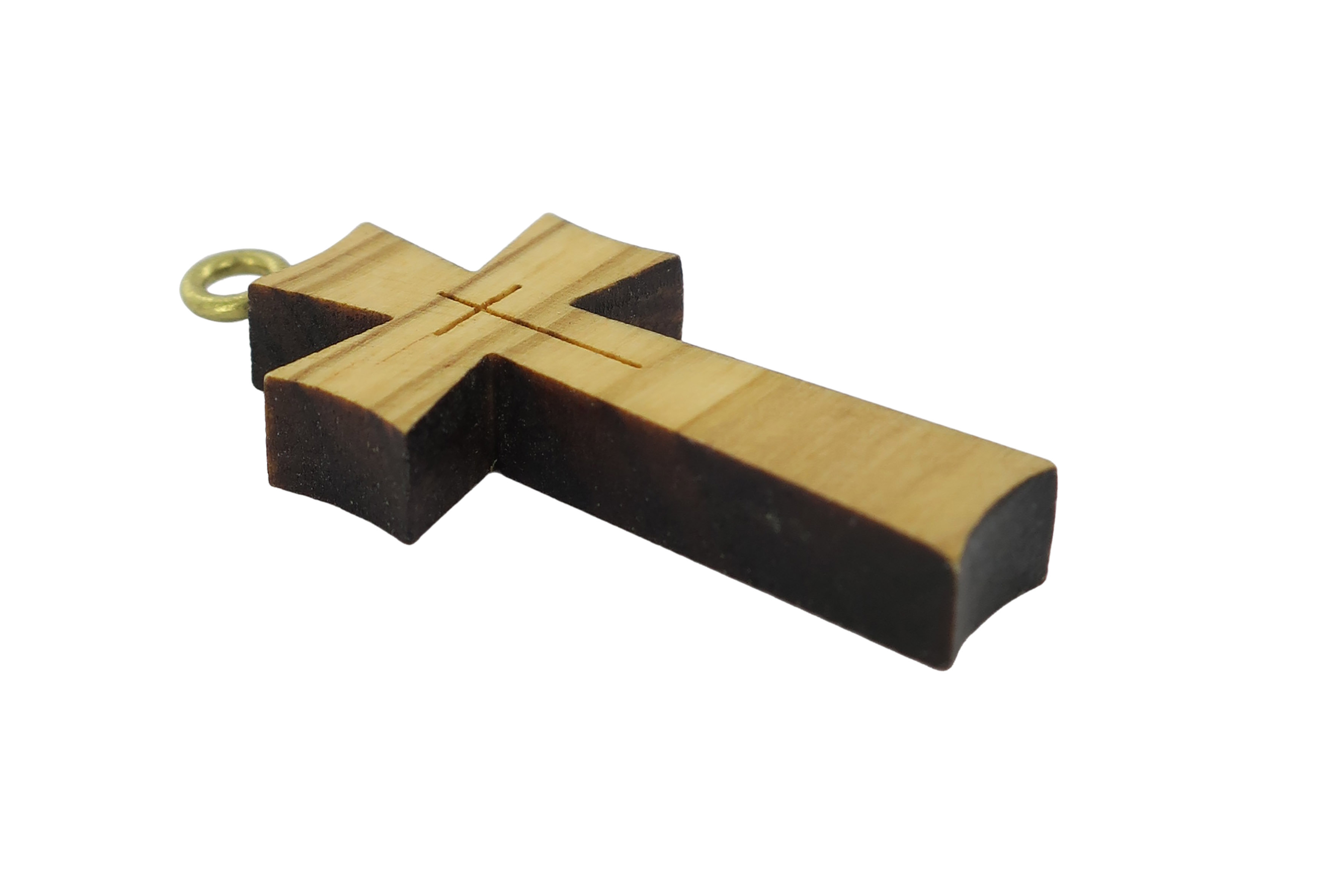 Croce in legno d'ulivo sagomata con incisione. Completo di cordoncino.