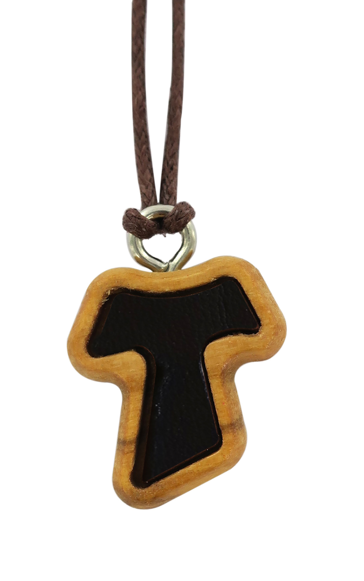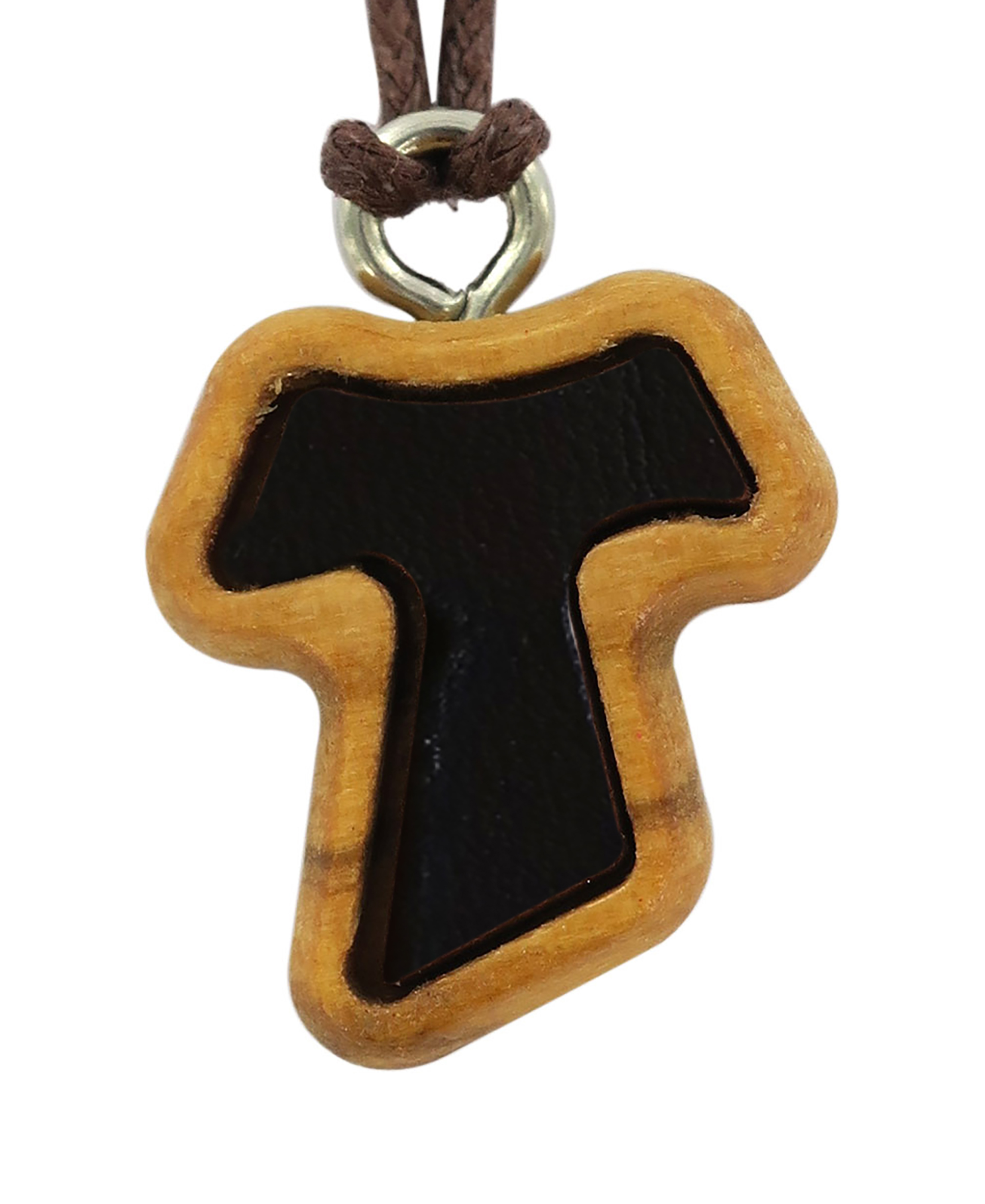 Croce Tau in legno di ulivo e cuoio con cordoncino (croce di San Francesco d'Assisi) - 1,5 cm