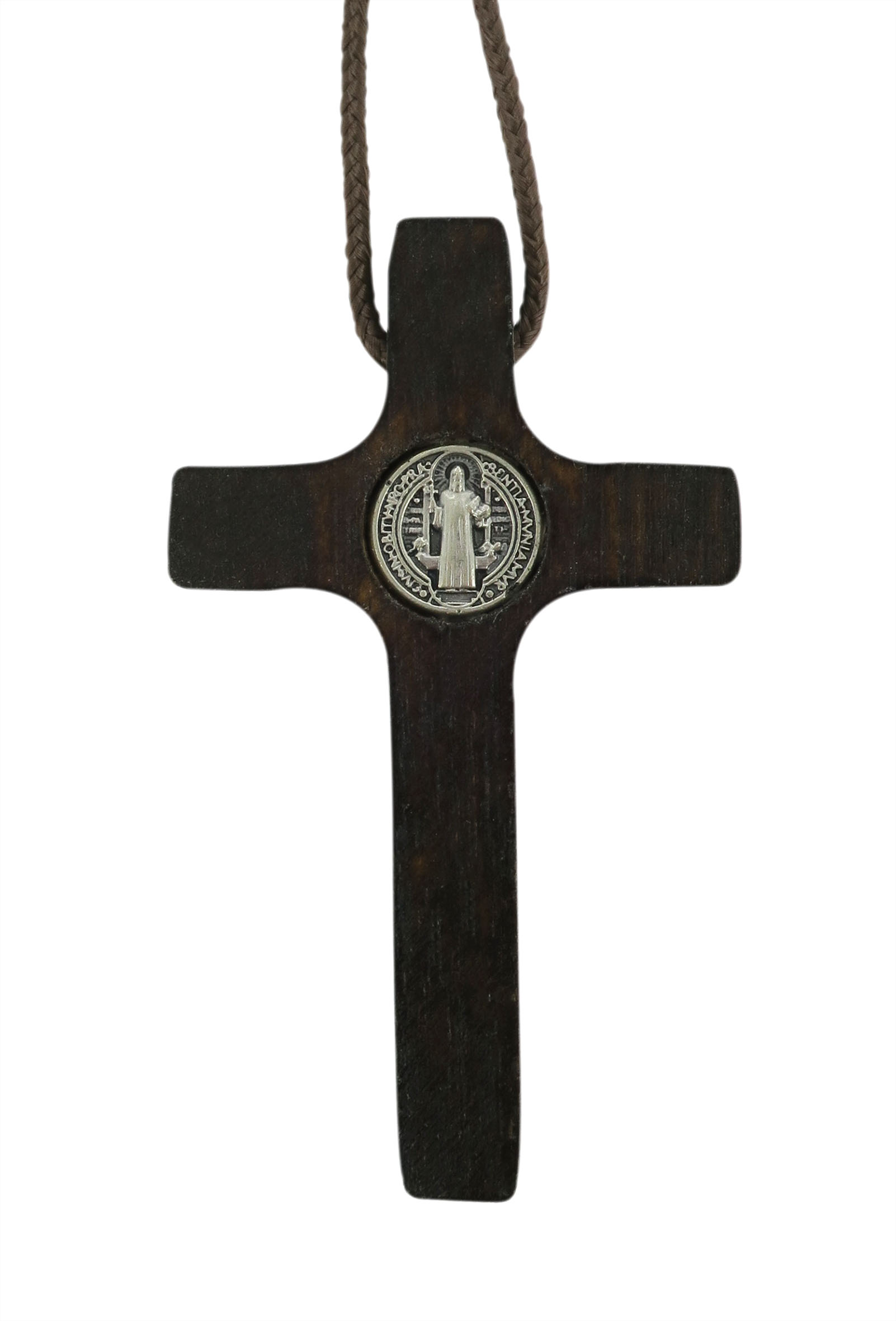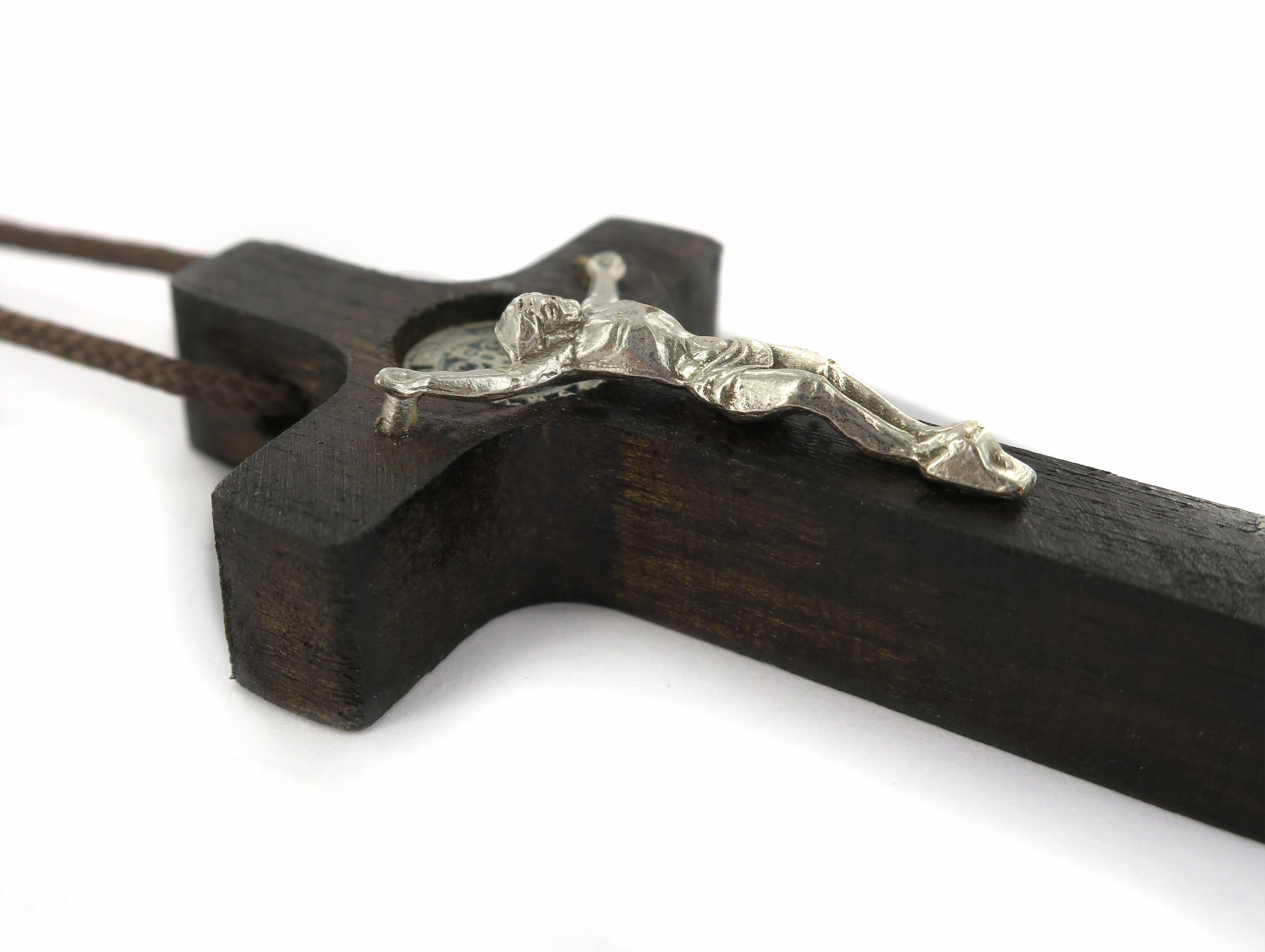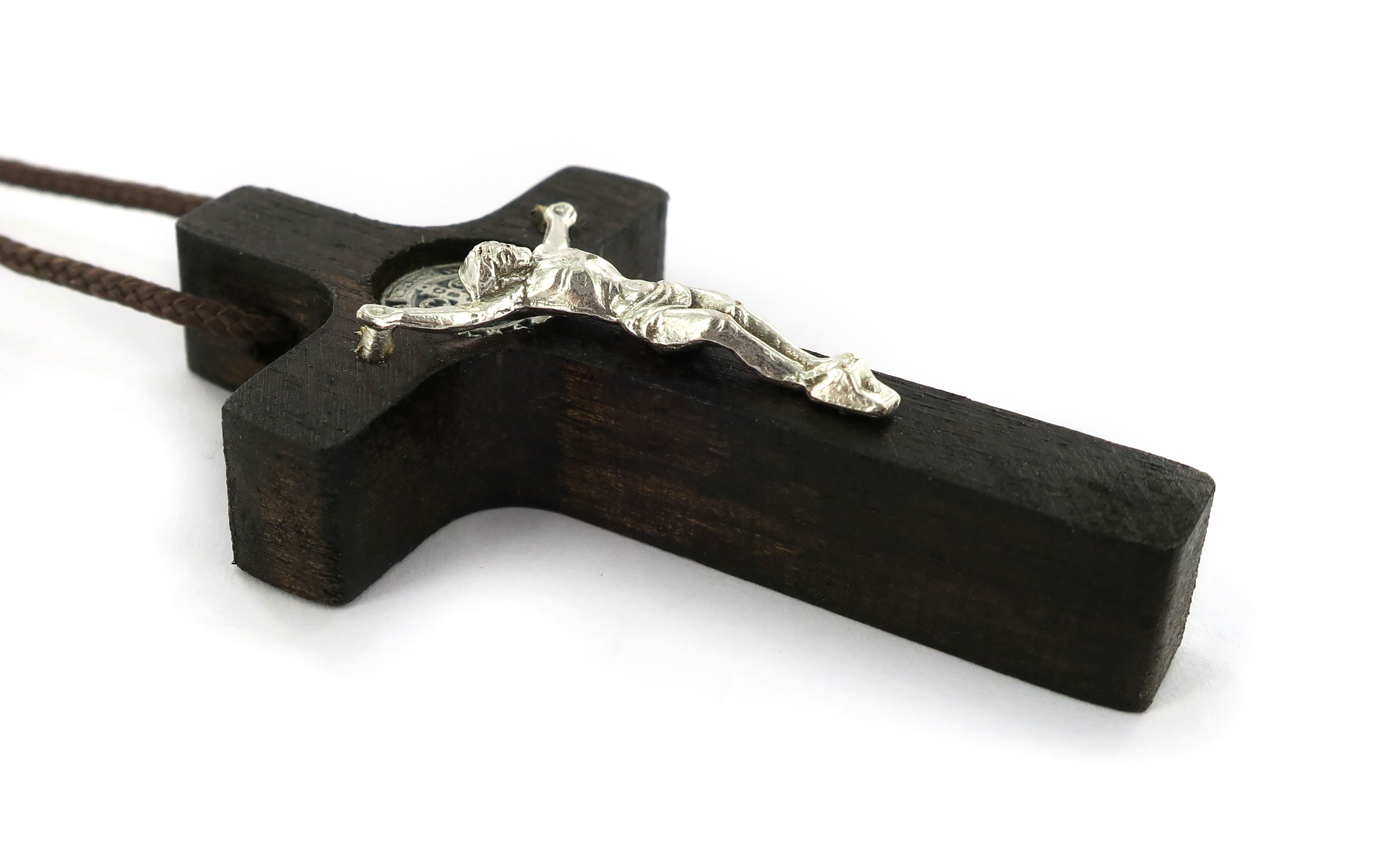 Croce di San Benedetto in legno con Cristo in metallo argentato. Altezza della croce: 5 cm.