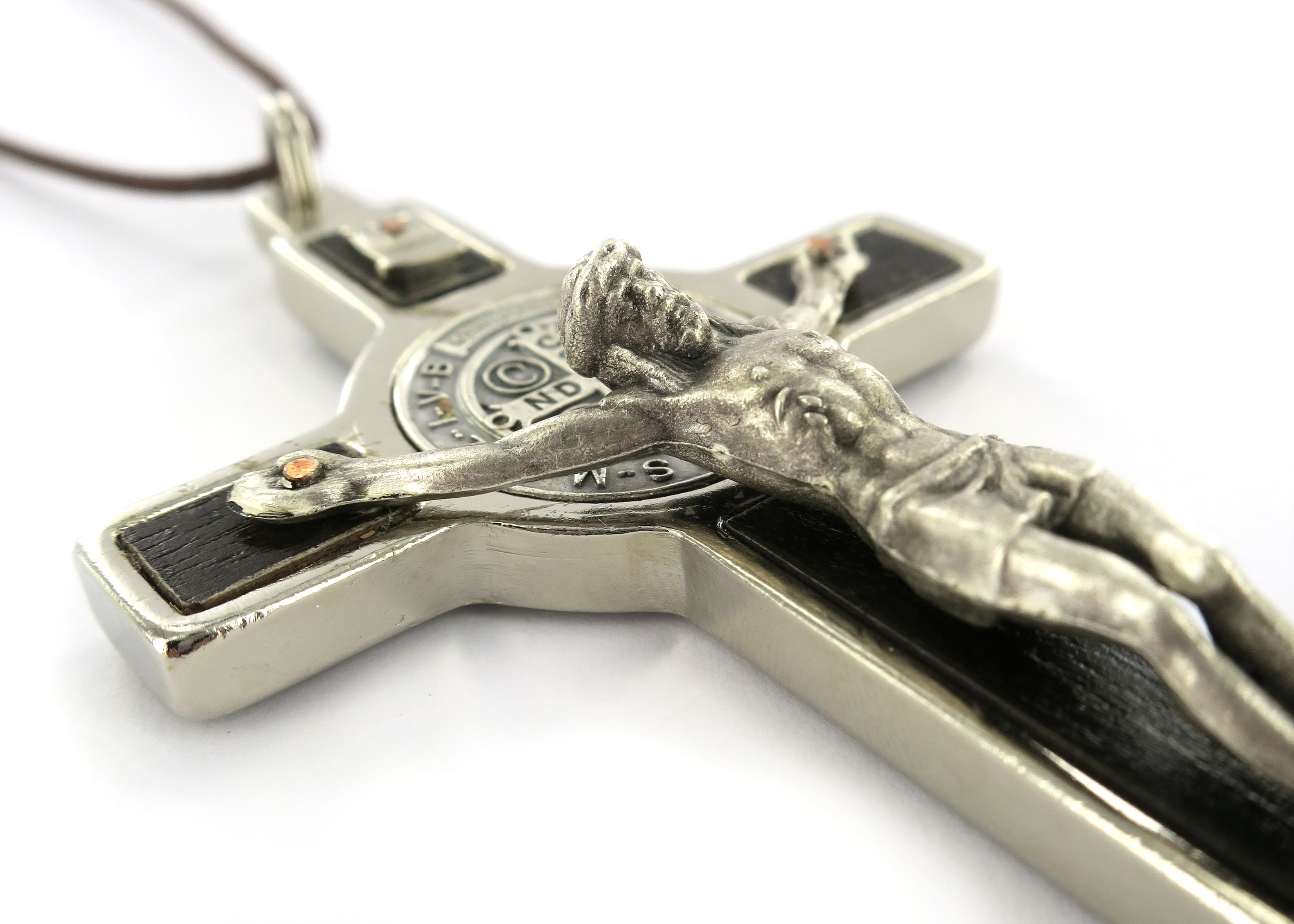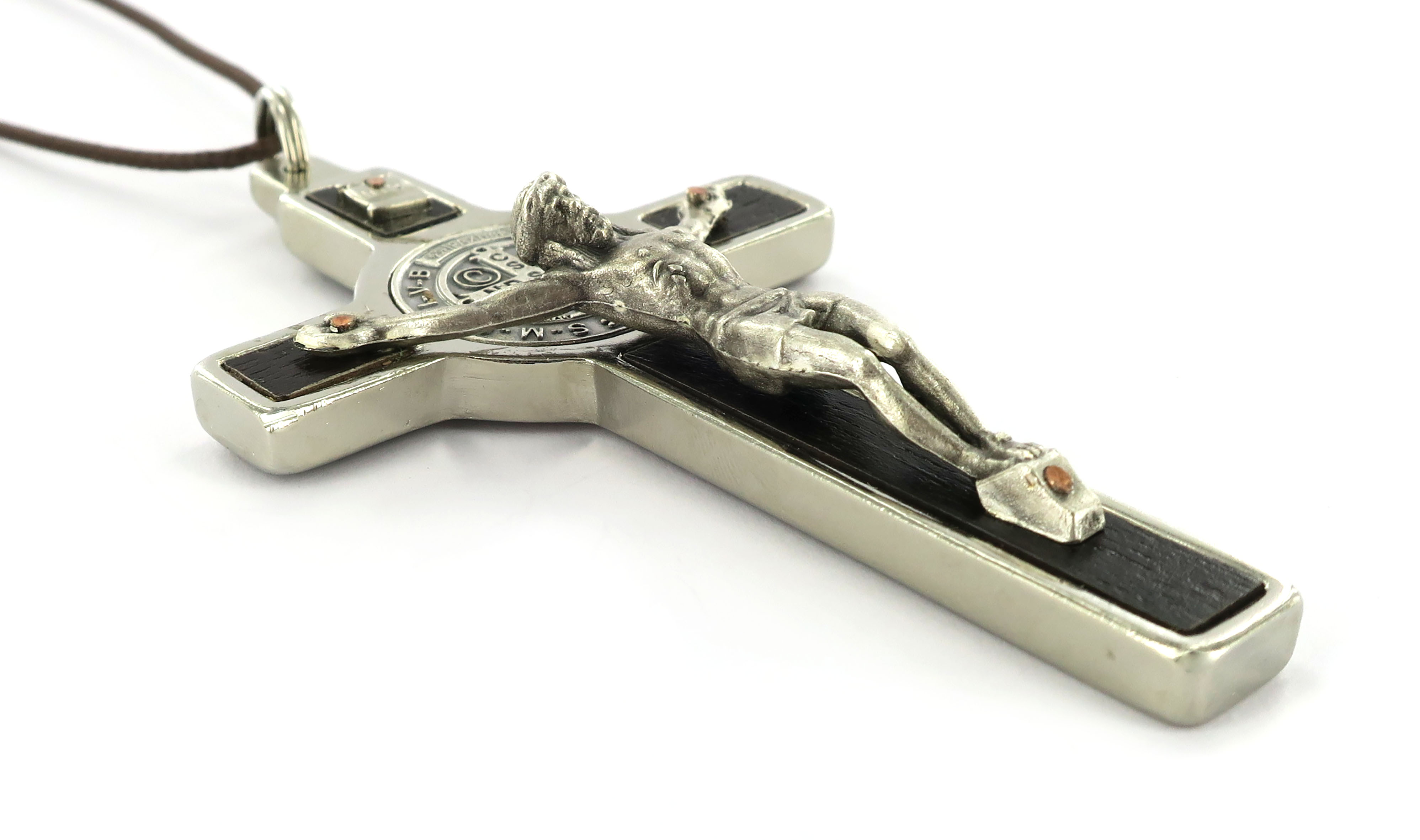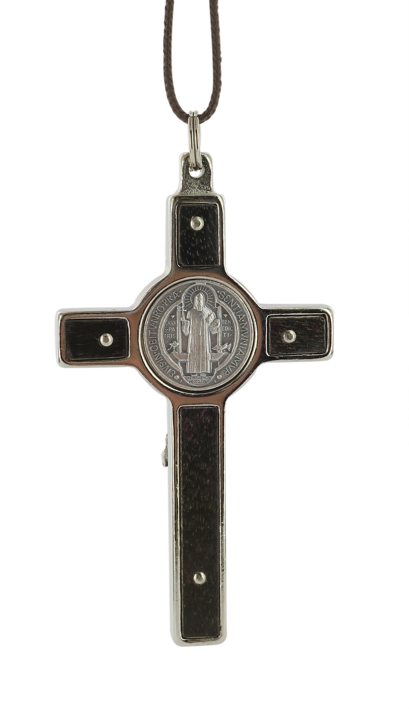 Croce di San Benedetto in legno con Cristo in metallo argentato.