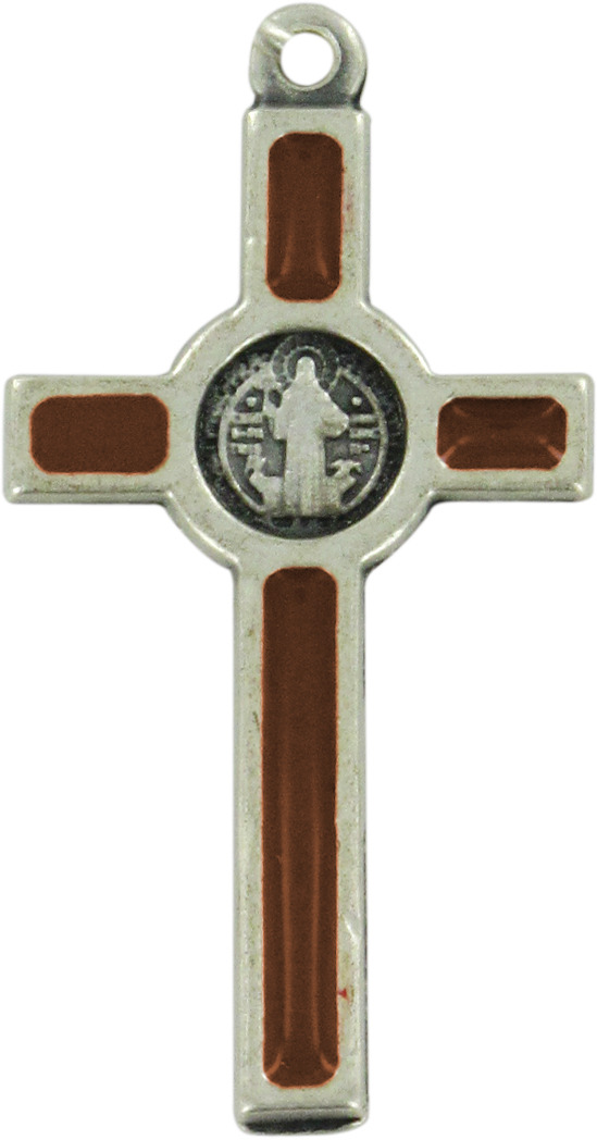 Croce di San Benedetto in metallo nichelato con sfondo in smalto marrone.