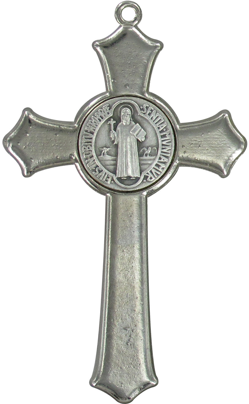 Croce di San Benedetto in metallo nichelato con sfondo in smalto rosso.