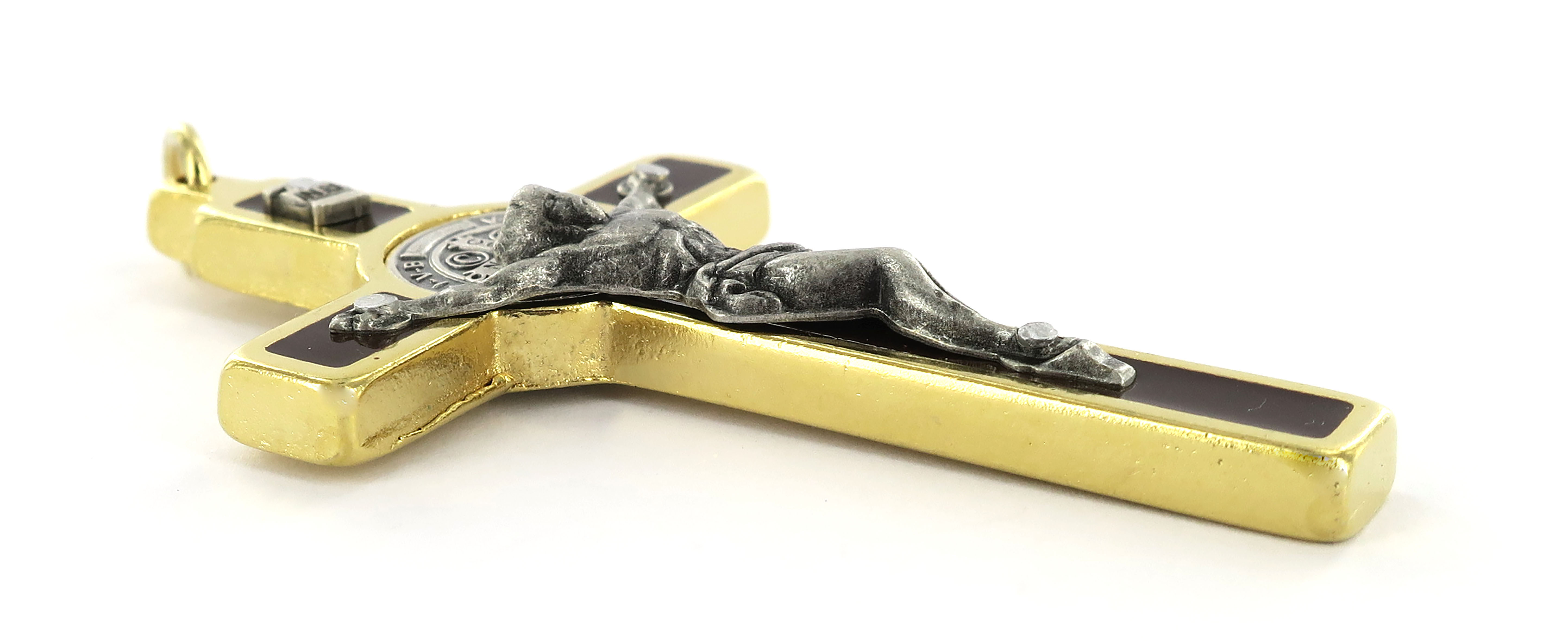 Croce di San Benedetto in ottone dorato lucido con sfondo in smalto marrone e con il corpo di Cristo in metallo argentato.