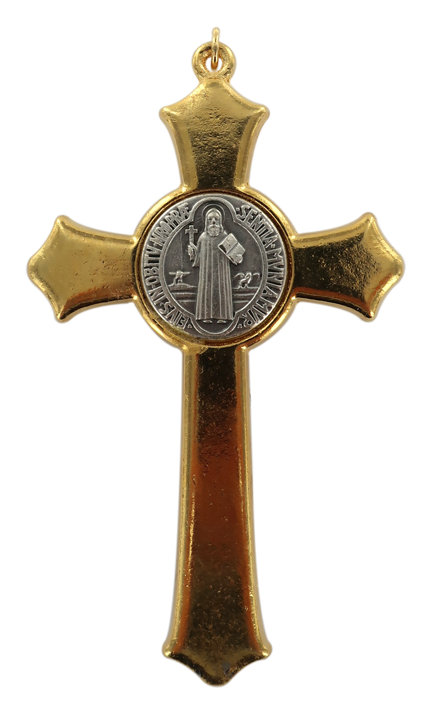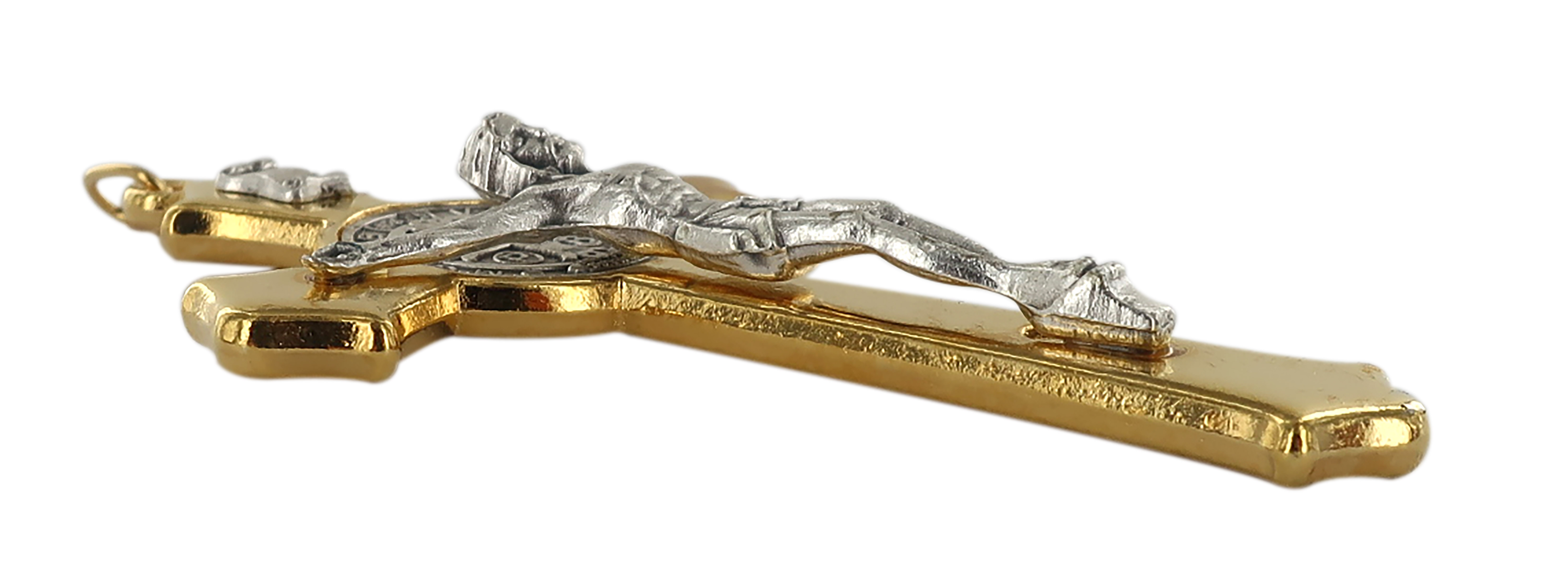 Croce di San Benedetto in zama dorata con corpo di Cristo in metallo argentato.