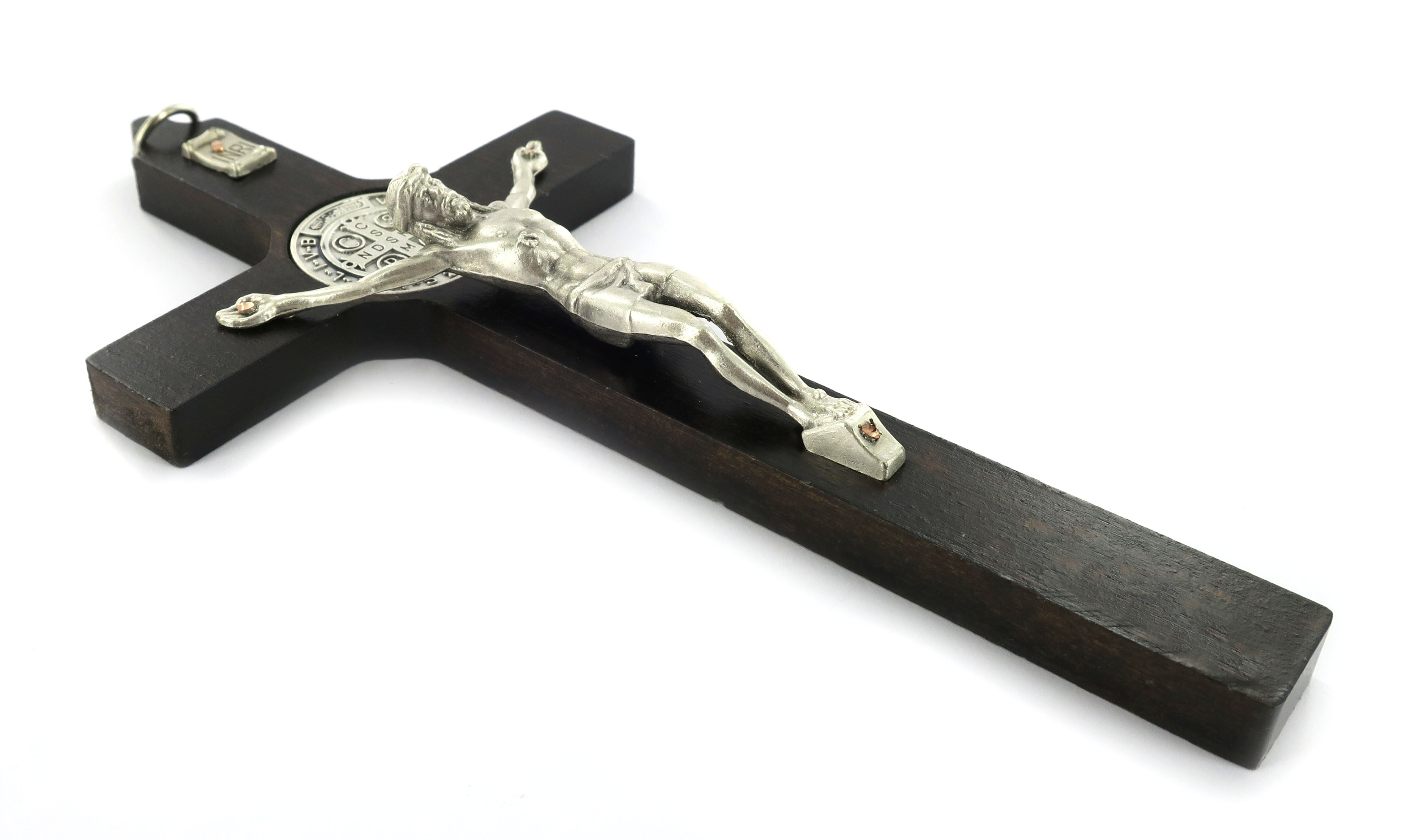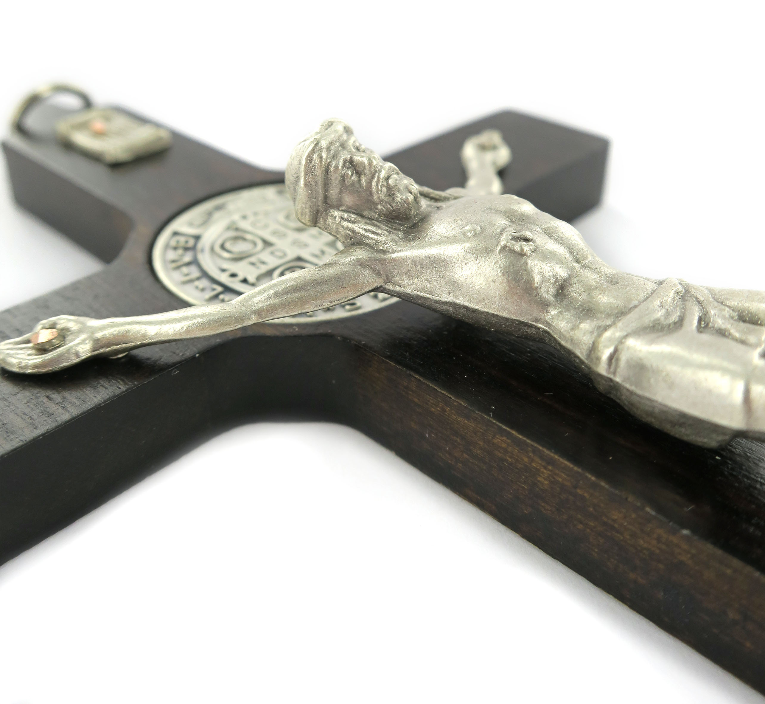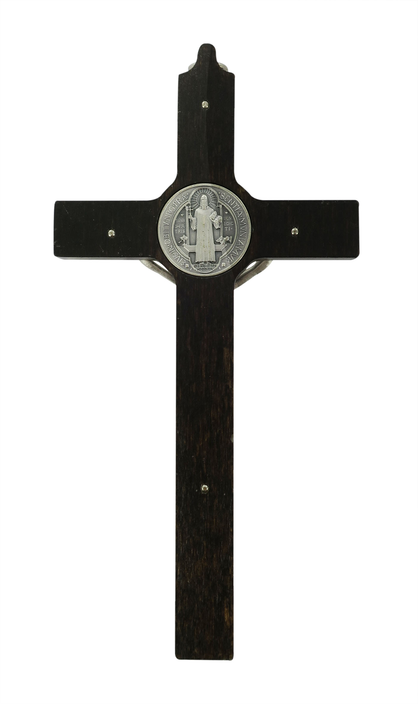 Crocifisso di San Benedetto in legno con Cristo in metallo argentato. Altezza della croce: 16 cm.