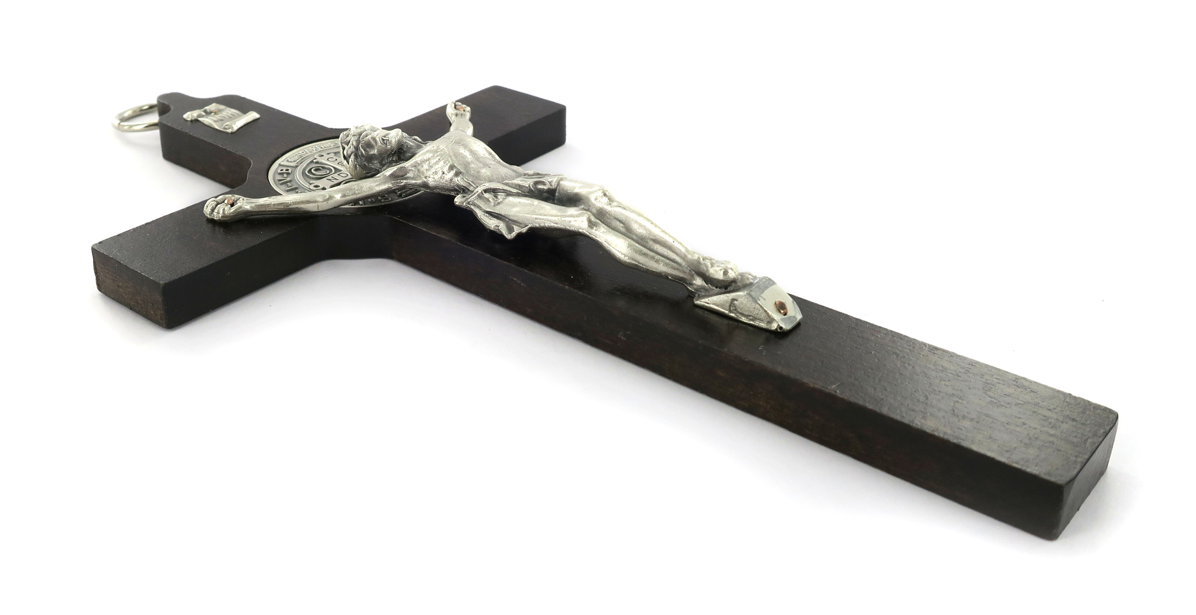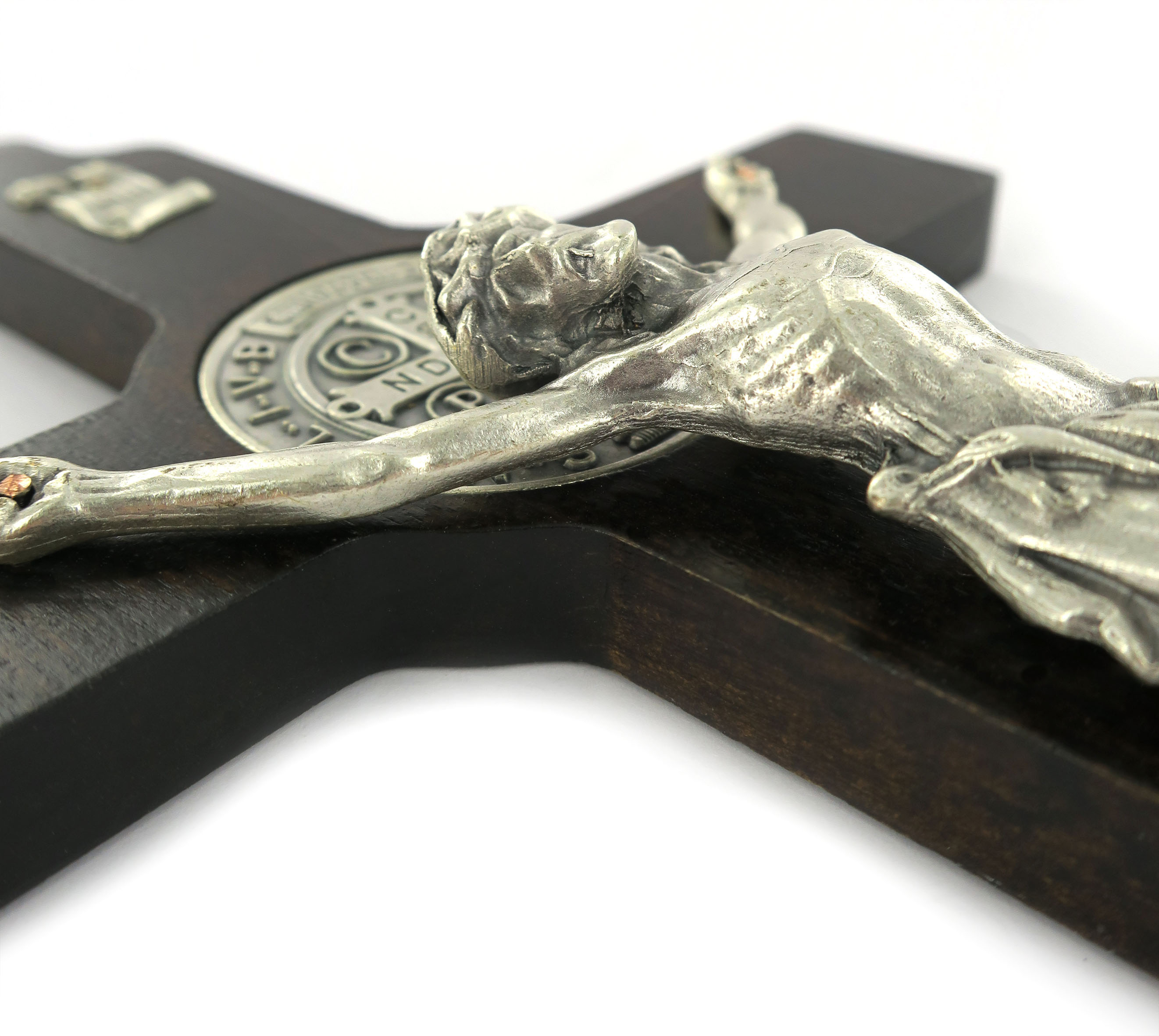 Crocifisso di San Benedetto in legno di noce con il corpo di Cristo e la medaglia in metallo argentato.