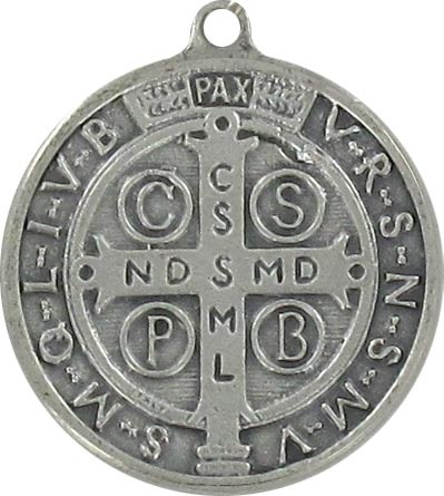 Medaglia rotonda raffigurante San Benedetto da Norcia, in abiti monastici, con la croce (simbolo di Salvezza) e il libro aperto (che rappresenta la Regola) in mano. Il retro riporta, invece, la croce del Santo Padre Benedetto, dove sono scritte le varie abbreviazioni dei versi di una preghiera, tra le più utilizzate per esorcismi, che rinnega e allontana il male: