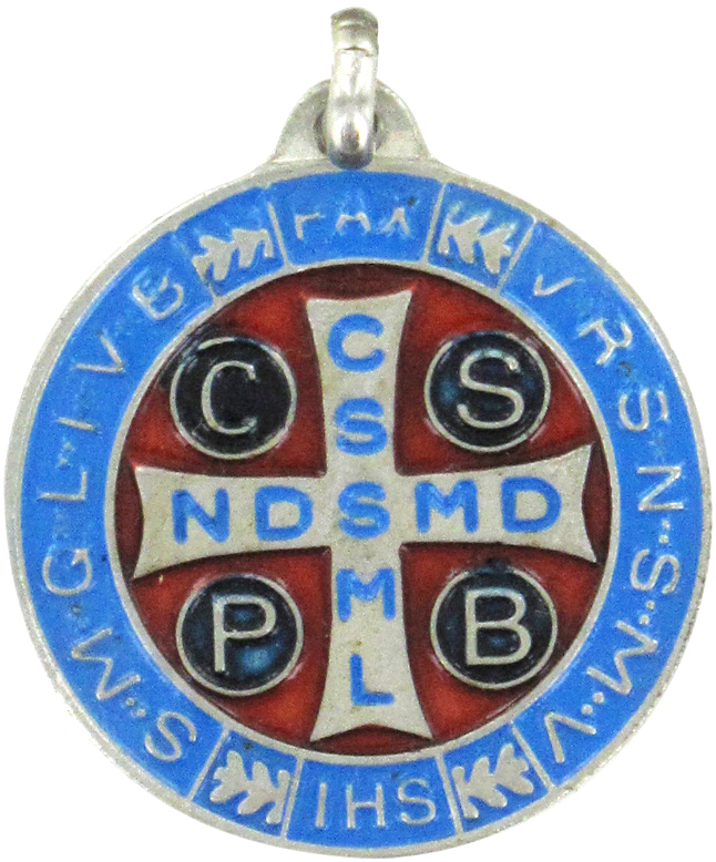 La medaglia del diametro di cm. 3 è in metallo argentato con smalto ad anello di San Benedetto.