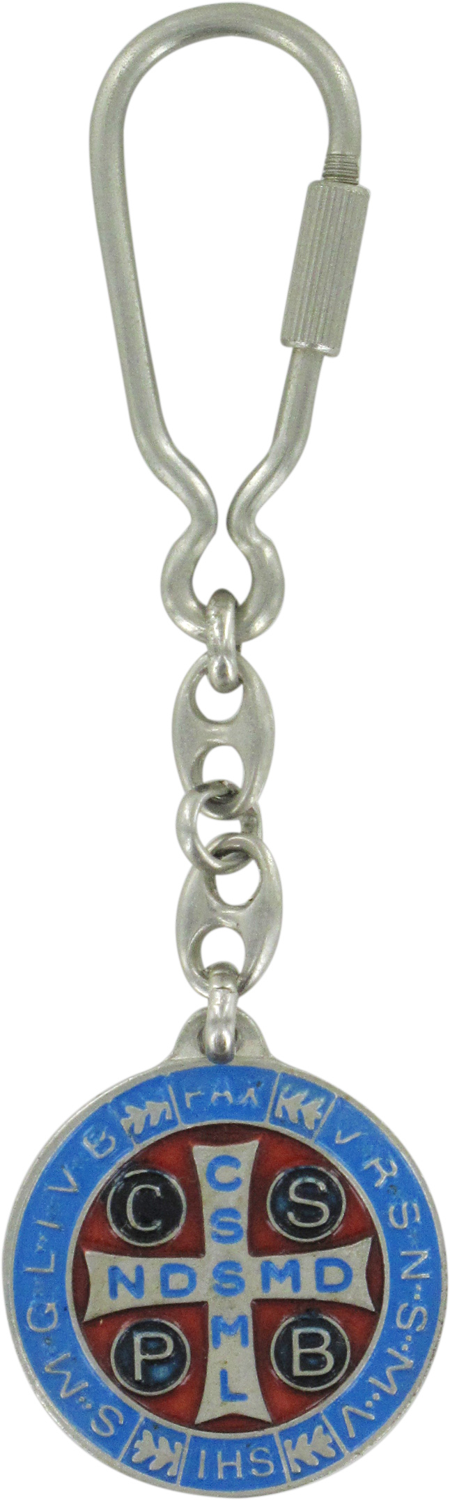 Portachiavi della medaglia di San Benedetto, realizzato in metallo argentato e smalto blu.
