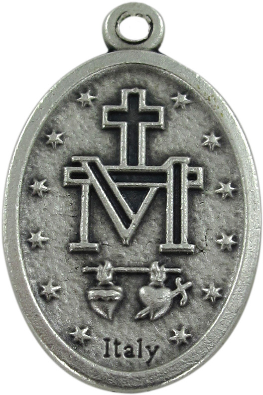 Medaglia raffigurante la Madonna Miracolosa, realizzata in metallo.