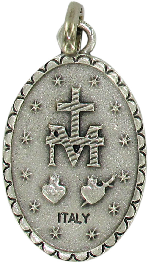 Medaglia ovale raffigurante la Madonna Miracolosa in metallo.