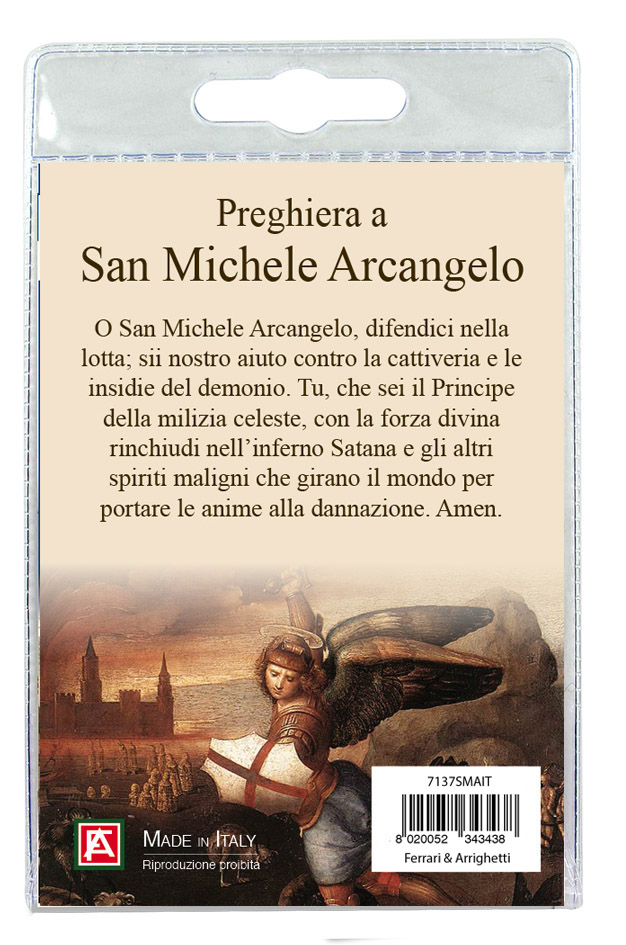 Medaglia di San Michele di cm 2,5 in metallo nichelato con laccio. L'immagine del Santo è ricoperta da uno strato di resina trasparente. La medagia si presenta confezionata in un blister con all'interno un cartoncino con immagine del Santo e con una preghiera in italiano sul retro del cartoncino stesso.