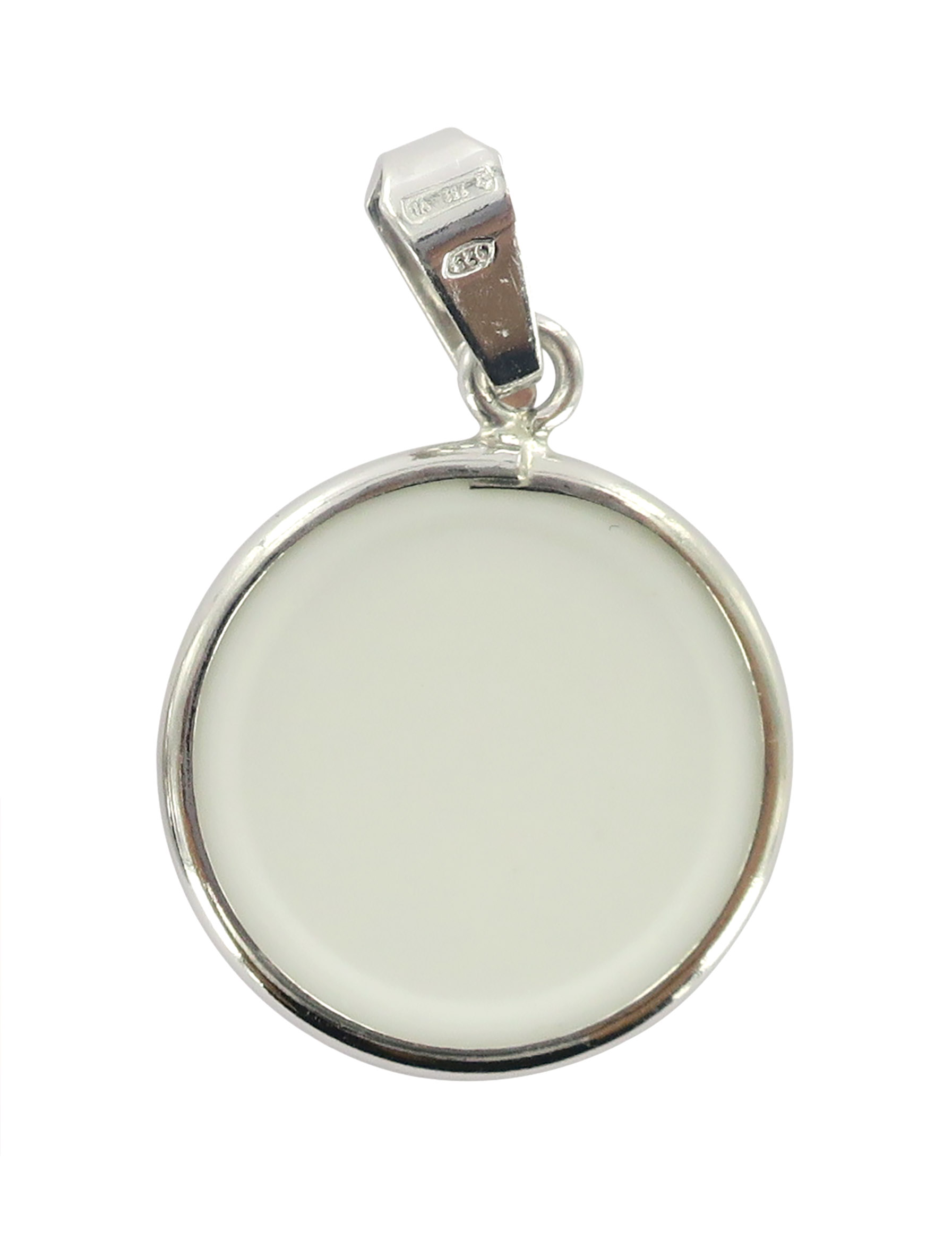 Il bordo in argento 925 incornicia il tutto. Il diametro è di cm 1,8. Il peso è di 1,5 gr. Realizzato in Italia.