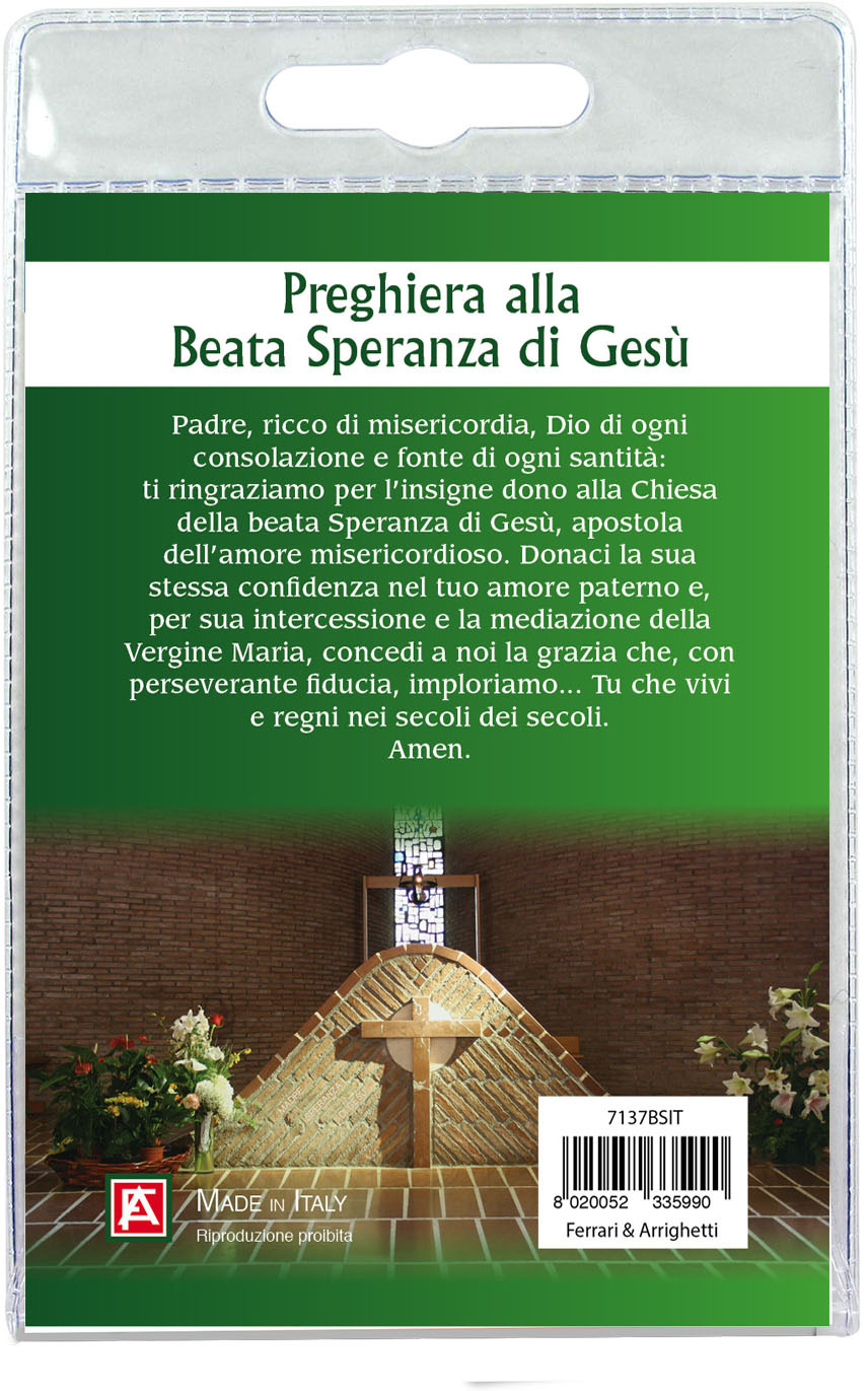 Medaglia Beata Speranza di Gesù di cm 2,5 in metallo nichelato con laccio. L'immagine della Santa è ricoperta da uno strato di resina trasparente. La medaglia si presenta confezionata in un blister con all'interno un cartoncino con immagine della Madre Speranza di Gesù e con una preghiera in italiano sul retro del cartoncino stesso. Realizzato in Italia.