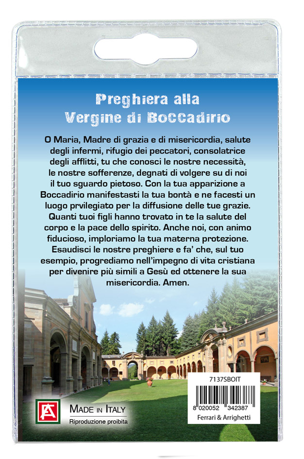Medaglia della Beata Vergine di Boccadirio di cm 2,5 in metallo nichelato con laccio. L'immagine della Vergine è ricoperta da uno strato di resina trasparente. La medagia si presenta confezionata in un blister con all'interno un cartoncino con immagine della Vergine e con una preghiera in italiano sul retro del cartoncino stesso.