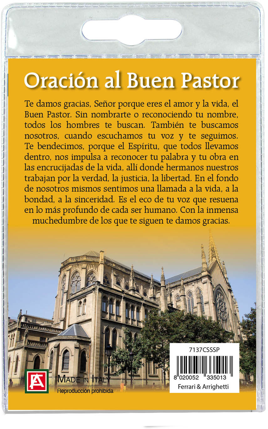 Medaglia della cattedrale del Buon Pastore (San Sebastián, Spagna) di cm 2,5 in metallo nichelato con laccio. L'immagine è ricoperta da uno strato di resina trasparente. La medagia si presenta confezionata in un blister con all'interno un cartoncino con immagine della cattedrale e con una preghiera in spagnolo sul retro del cartoncino stesso. Realizzato in Italia.