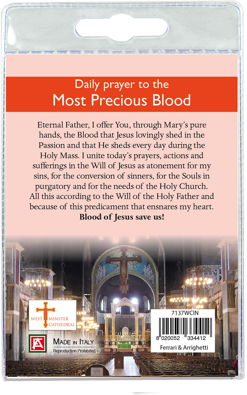 Medaglia immagine crocifisso di cm 2,5 in metallo nichelato con laccio. L'immagine è ricoperta da uno strato di resina trasparente. La medagia si presenta confezionata in un blister con all'interno un cartoncino con immagine della Cattedrale di Westminster e con una preghiera sul retro del cartoncino stesso.