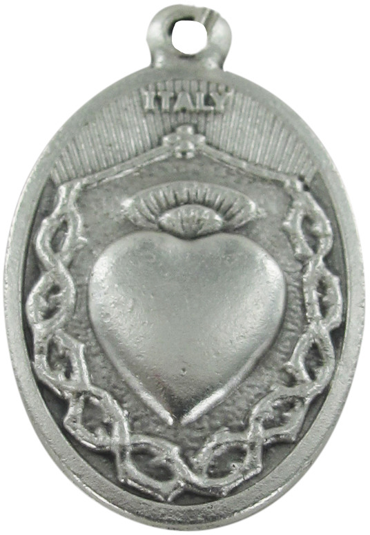 Medaglia ovale in metallo ossidato raffigurante in una faccia Gesù Bambino di Praga e sull'altra il cuore.