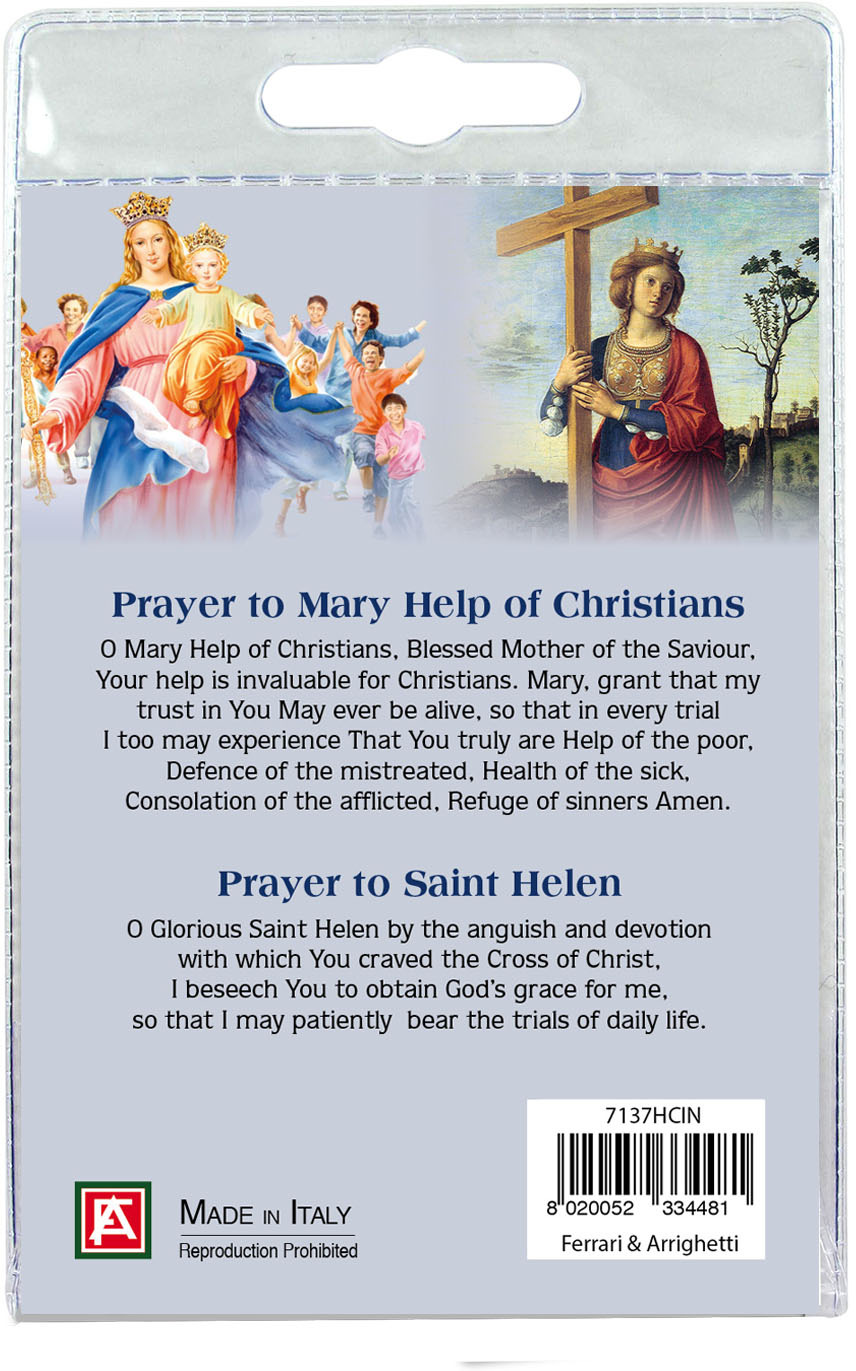 Medaglia Madonna Ausiliatrice di cm 2,5 in metallo nichelato con laccio. L'immagine della Madonna è ricoperta da uno strato di resina trasparente. La medagia si presenta confezionata in un blister con all'interno un cartoncino con immagine di St Helen's Catholic Church e con una preghiera in inglese sul retro del cartoncino stesso. Realizzato in Italia.