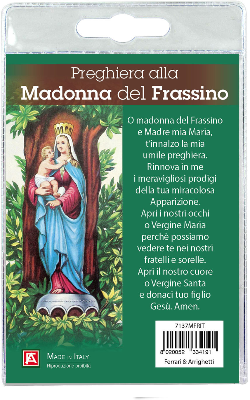 La medaglia, in metallo nichelato, ha un cordino in stoffa e su di essa vi è la resina raffigurante la Madonna del Frassino. La medaglia misura 2,5 centimetri e verrà consegnata in un blister. All'interno del blister c'è un cartoncino rappresentante Madonna del Frassino, e sul retro vi è stampata una preghiera dedicata a lei. Realizzato in Italia.