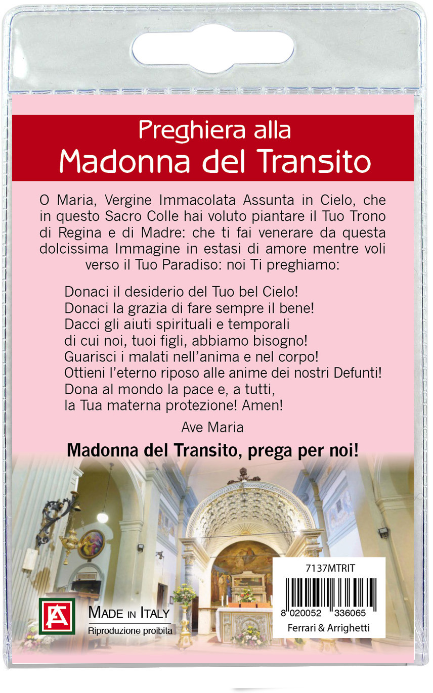 Medaglia della Madonna del Transito di cm 2,5 in metallo nichelato con laccio. L'immagine della Madonna è ricoperta da uno strato di resina trasparente. La medaglia si presenta confezionata in un blister con all'interno un cartoncino con immagine della Madonna e con una preghiera in italiano sul retro del cartoncino stesso.