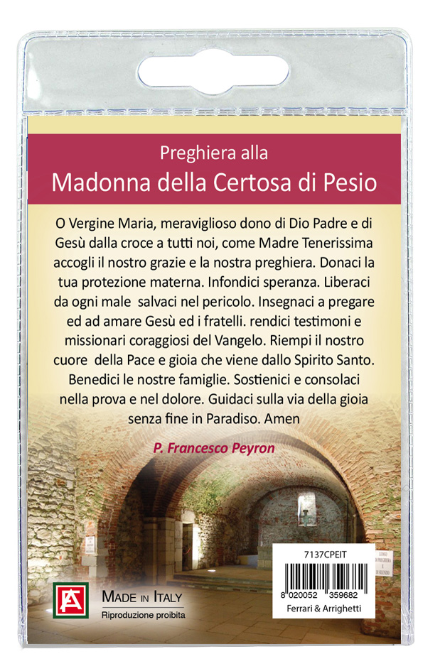 Medaglia Madonna della Certosa di Pesio di cm 2,5 in metallo nichelato con laccio. L'immagine della Madonna è ricoperta da uno strato di resina trasparente. La medaglia si presenta confezionata in un blister con all'interno un cartoncino con immagine della Madonna e con una preghiera in italiano sul retro del cartoncino stesso.