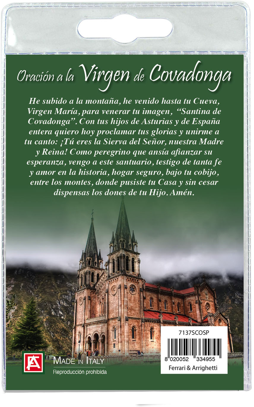 Medaglia Madonna di Covadonga di cm 2,5 in metallo nichelato con laccio. L'immagine della Madonna è ricoperta da uno strato di resina trasparente. La medagia si presenta confezionata in un blister con all'interno un cartoncino con immagine della Madonna e con una preghiera in spagnolo sul retro del cartoncino stesso.