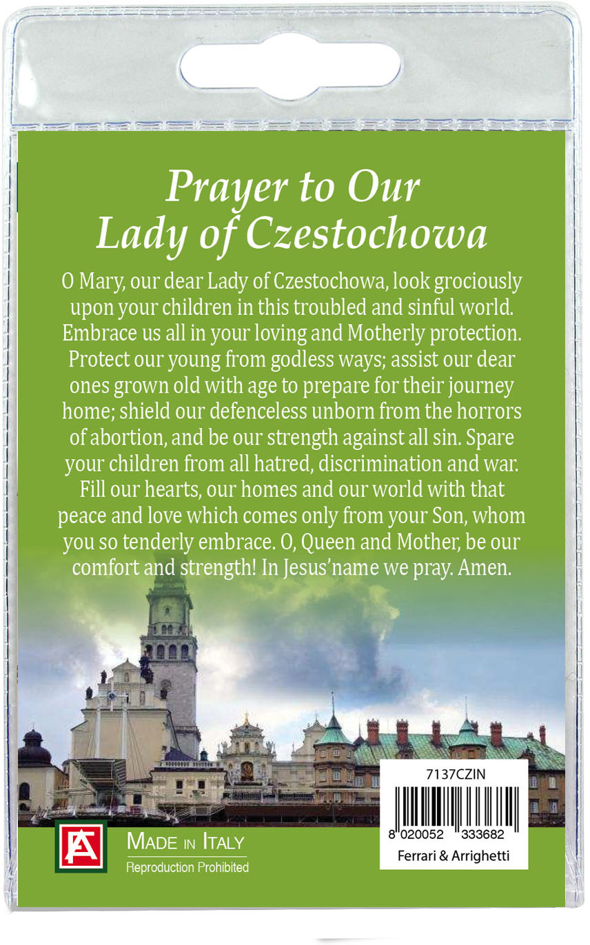 Medaglia Madonna di Czestochowa di cm 2,5 in metallo nichelato con laccio. L'immagine della Madonna è ricoperta da uno strato di resina trasparente. La medaglia si presenta confezionata in un blister con all'interno un cartoncino con immagine della Madonna e con una preghiera in inglese sul retro del cartoncino stesso.