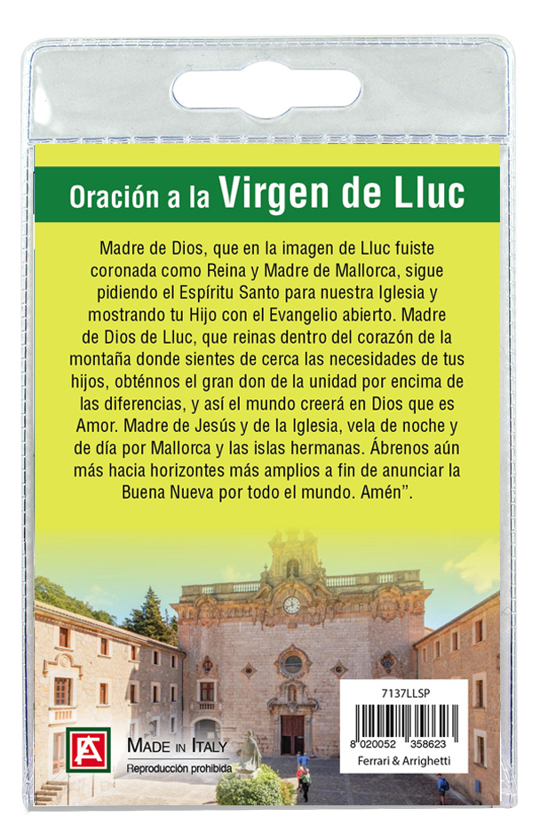 Medaglia Madonna di Lluc di cm 2,5 in metallo nichelato con laccio. L'immagine della Madonna è ricoperta da uno strato di resina trasparente. La medaglia si presenta confezionata in un blister con all'interno un cartoncino con immagine della Madonna e con una preghiera in spagnolo sul retro del cartoncino stesso.