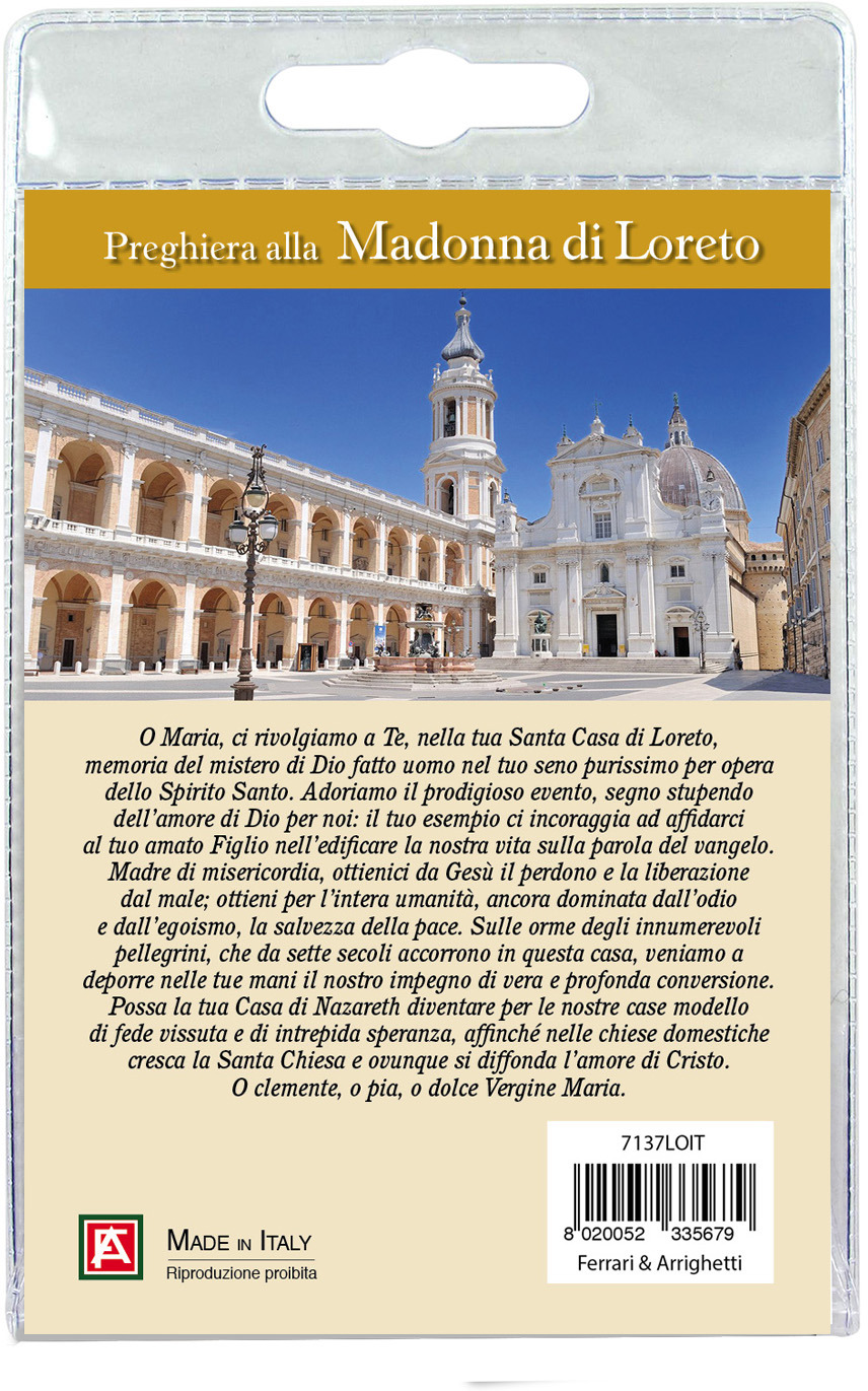 Medaglia Madonna di Loreto di cm 2,5 in metallo nichelato con laccio. L'immagine della Madonna è ricoperta da uno strato di resina trasparente. La medaglia si presenta confezionata in un blister con all'interno un cartoncino con immagine della Madonna di Loreto e con una preghiera in italiano sul retro del cartoncino stesso.