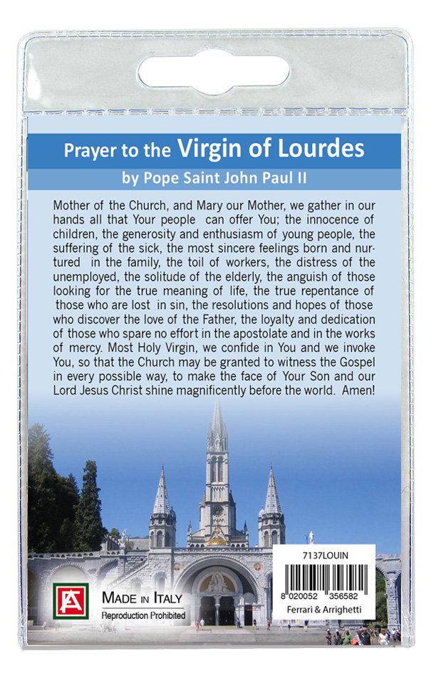 Medaglia Madonna di Lourdes di cm 2,5 in metallo nichelato con laccio. L'immagine della Madonna è ricoperta da uno strato di resina trasparente. La medaglia si presenta confezionata in un blister con all'interno un cartoncino con immagine dell'Apparizione di Lourdes e con una preghiera in inglese sul retro del cartoncino stesso.