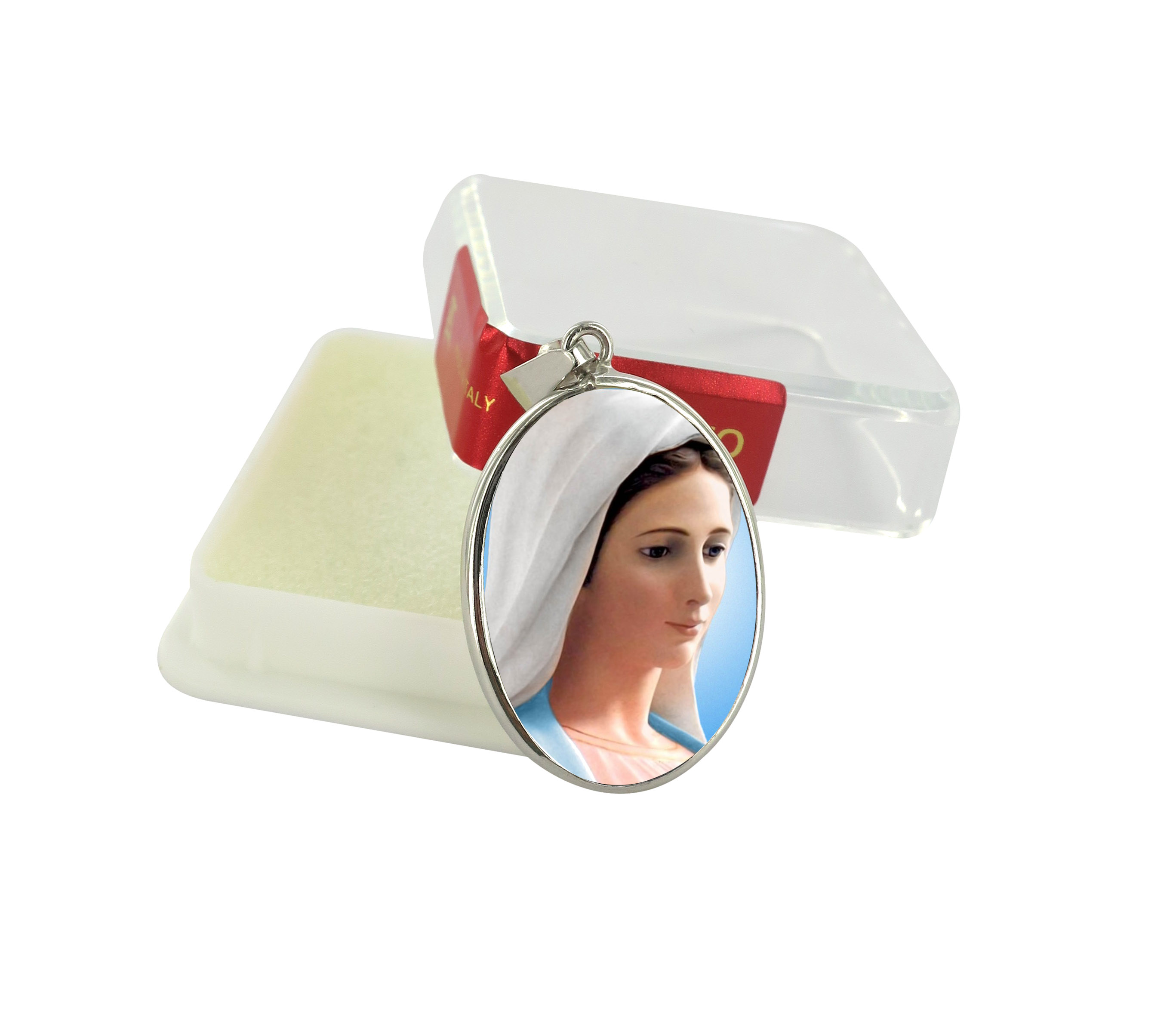La medaglia è in porcellana con stampata una immagine rappresentante Madonna di Medjugorje.