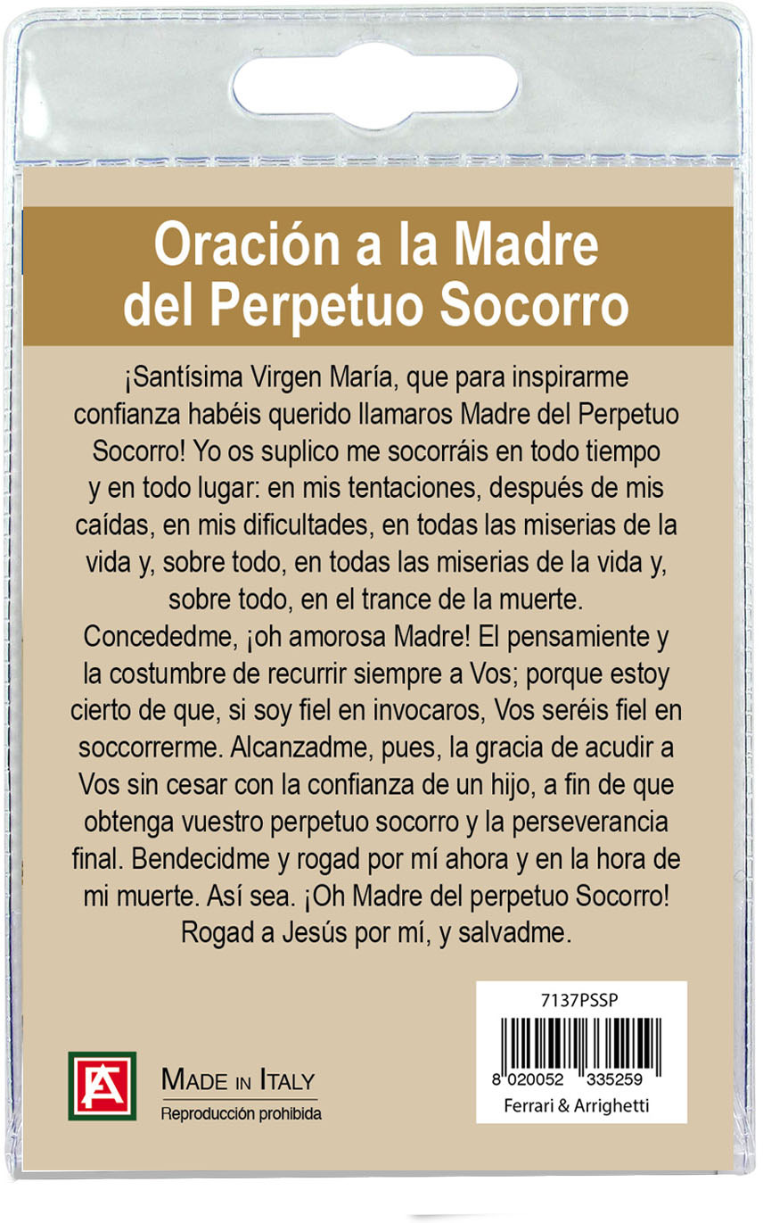 Medaglia Madonna di Perpetuo Soccorso di cm 2,5 in metallo nichelato con laccio. L'immagine della Madonna è ricoperta da uno strato di resina trasparente. La medagia si presenta confezionata in un blister con all'interno un cartoncino con immagine della Madonna e con una preghiera in spagnolo sul retro del cartoncino stesso.