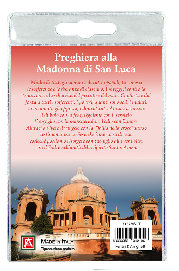 Medaglia della Madonna di San Luca di cm 2,5 in metallo nichelato con laccio. L'immagine della Madonna è ricoperta da uno strato di resina trasparente. La medagia si presenta confezionata in un blister con all'interno un cartoncino con immagine del Santuario della Madonna di San Luca, e con una preghiera in italiano sul retro del cartoncino stesso.